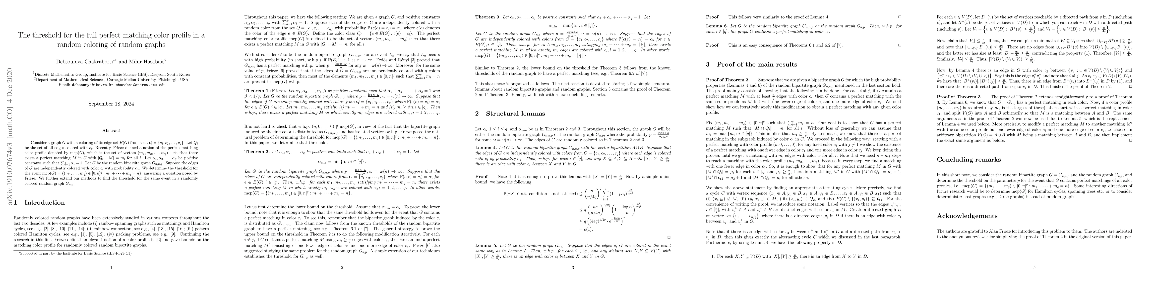 Consider a graph $G$ with a coloring of its edge set $E(G)$ from a set $Q = \set{c_1,c_2, \ldots, c_q}$. Let $Q_i$ be the set of all edges colored with $c_i$. Recently, Frieze defined a notion of the perfect matching color profile denoted by $\mcp(G)$, which is the set of vectors $(m_1, m_2, \ldots, m_q) \in [n]^q$ such that there exists a perfect matching $M$ in $G$ with $|Q_i \cap M| = m_i$ for all $i$. Let $\a_1, \a_2, \ldots, \a_q$ be positive constants such that $\sum_{i=1}^q \a_i = 1$. Let $G$ be the random bipartite graph $G_{n,n,p}$. Suppose the edges of $G$ are independently colored with color $c_i$ with probability $\alpha_i$. We determine the threshold for the event $\mcp(G) = \set{(m_1, \ldots, m_q) \in [0,n]^q : m_1 + \cdots + m_q = n}$, answering a question posed by Frieze. We further extend our methods to find the threshold for the same event in a randomly colored random graph $G_{n,p}$.
