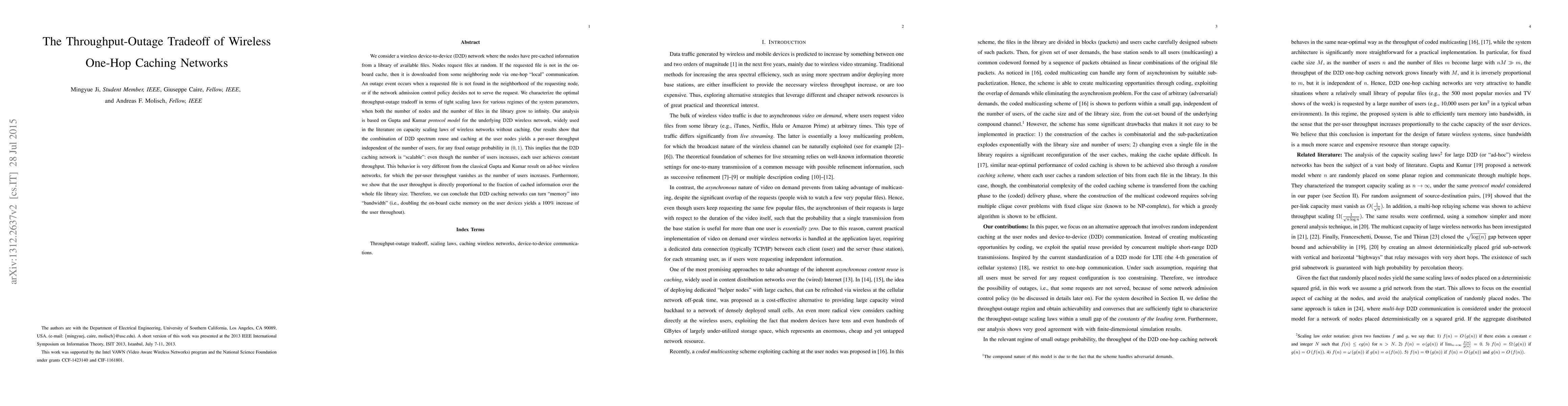This paper investigates the optimal throughput-outage tradeoff in wireless D2D caching networks, where nodes pre-cache files and request them randomly. It demonstrates that D2D caching enables scalable throughput, maintaining constant per-user throughput despite increasing users, contrasting with traditional ad-hoc networks. The study reveals that user throughput is directly proportional to the cached file fraction, indicating that increased cache memory can significantly boost user throughput.
