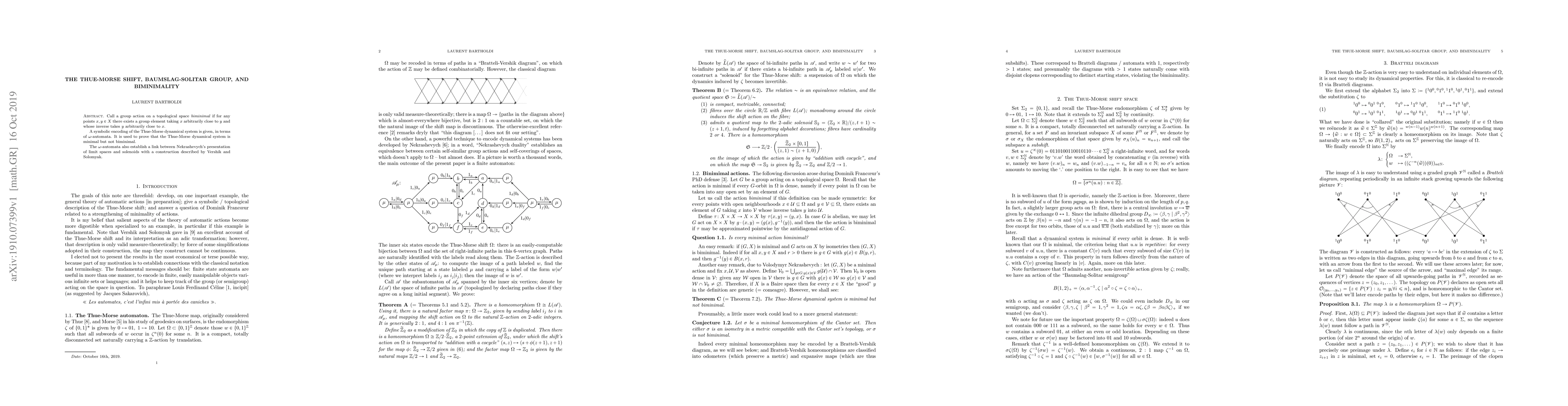 This paper explores the concept of biminimality in group actions on topological spaces, proving that the Thue-Morse dynamical system is minimal but not biminimal. It utilizes $\omega$-automata to establish a connection between Nekrashevych's limit spaces and Vershik-Solomyak constructions.