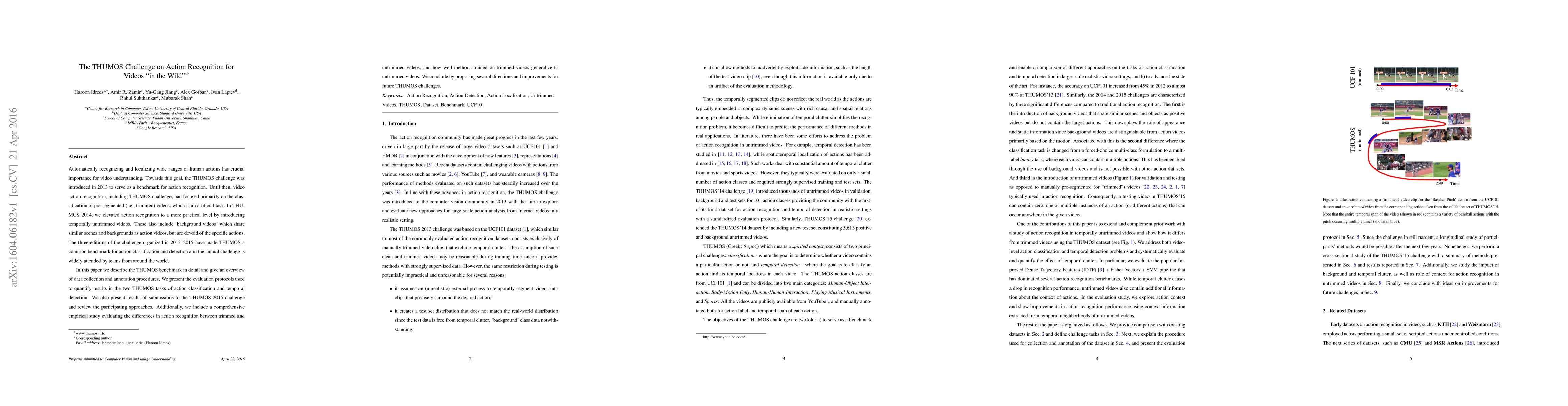 The THUMOS Challenge aims to advance the field of action recognition in untrimmed videos, providing a benchmark that contrasts with previous trimmed video approaches. The paper details the challenge's data collection, evaluation protocols, and results from the 2015 edition, while also discussing the generalization of methods trained on trimmed videos to untrimmed ones.