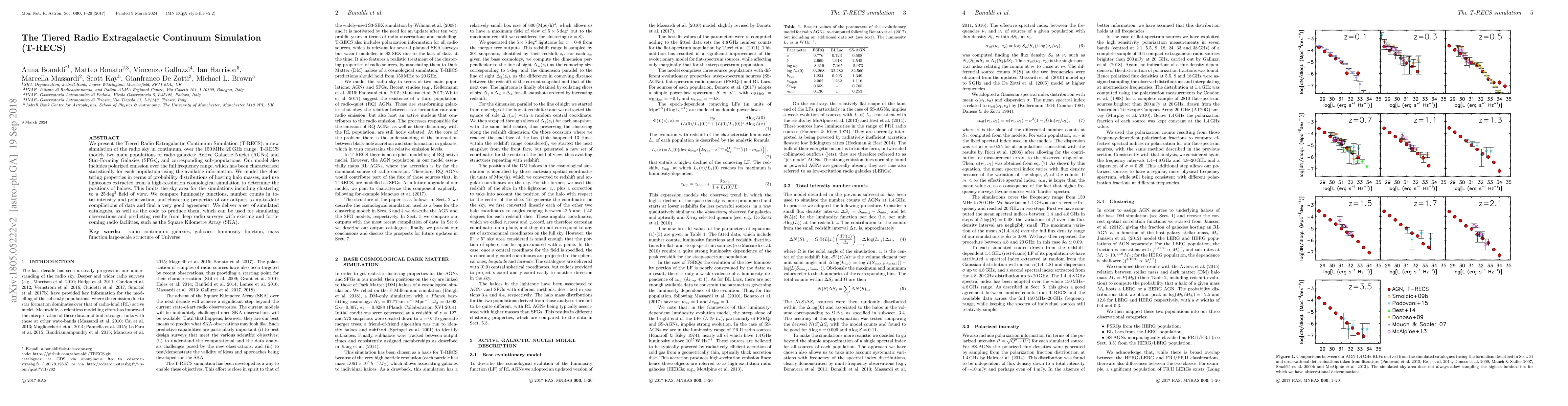 The Tiered Radio Extragalactic Continuum Simulation (T-RECS) models the radio sky across 150 MHz-20 GHz, focusing on AGNs and SFGs, and includes polarized emission. It compares well with observational data and provides tools for simulating future radio observations.