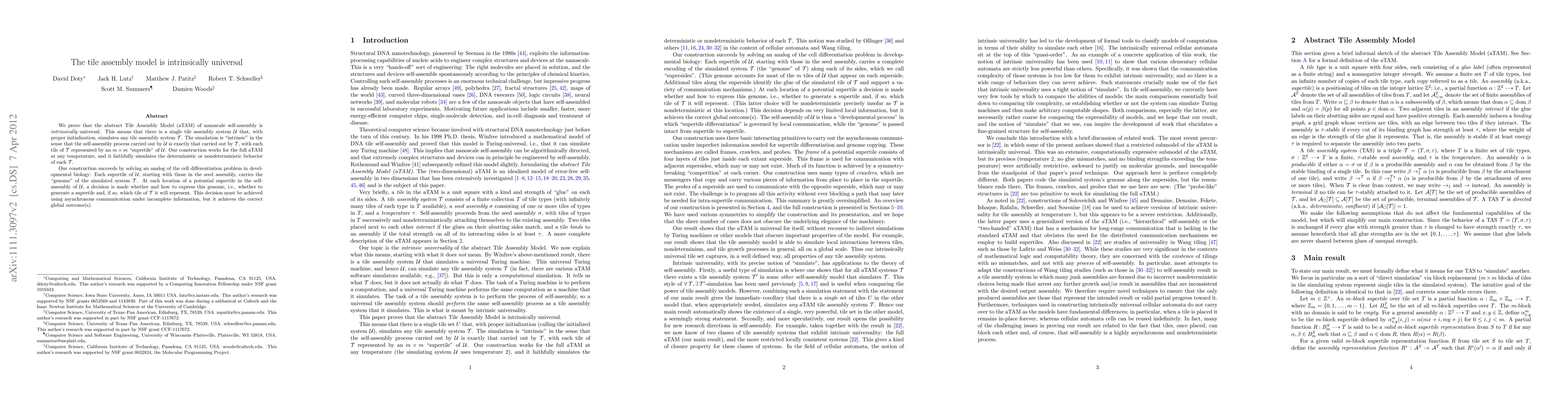 We prove that the abstract Tile Assembly Model (aTAM) of nanoscale self-assembly is intrinsically universal. This means that there is a single tile assembly system U that, with proper initialization, simulates any tile assembly system T. The simulation is "intrinsic" in the sense that the self-assembly process carried out by U is exactly that carried out by T, with each tile of T represented by an m x m "supertile" of U. Our construction works for the full aTAM at any temperature, and it faithfully simulates the deterministic or nondeterministic behavior of each T. Our construction succeeds by solving an analog of the cell differentiation problem in developmental biology: Each supertile of U, starting with those in the seed assembly, carries the "genome" of the simulated system T. At each location of a potential supertile in the self-assembly of U, a decision is made whether and how to express this genome, i.e., whether to generate a supertile and, if so, which tile of T it will represent. This decision must be achieved using asynchronous communication under incomplete information, but it achieves the correct global outcome(s).