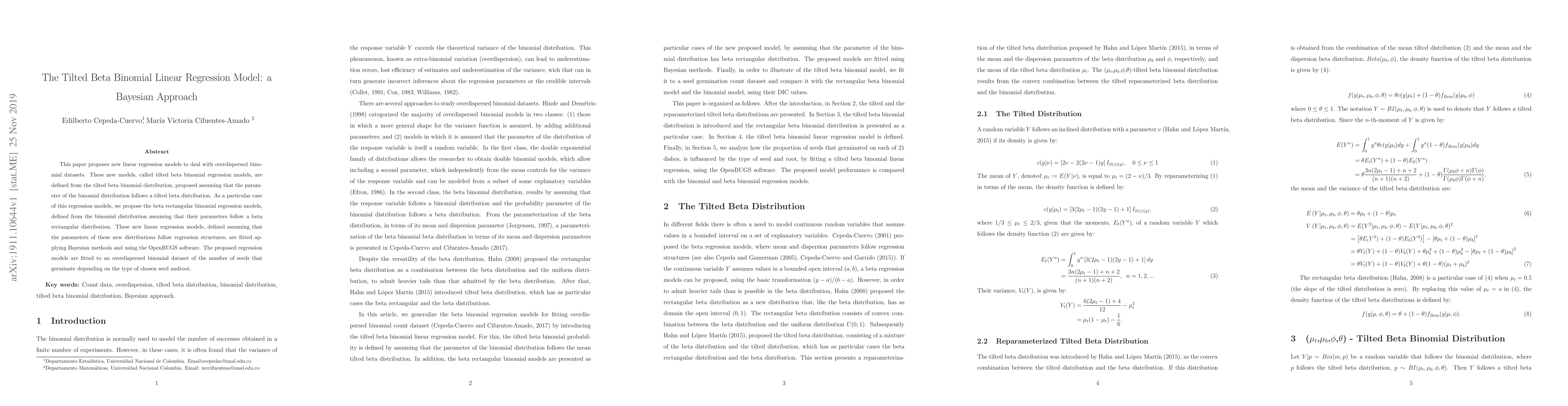 This paper proposes new linear regression models to deal with overdispersed binomial datasets. These new models, called tilted beta binomial regression models, are defined from the tilted beta binomial distribution, proposed assuming that the parameter of the binomial distribution follows a tilted beta distribution. As a particular case of this regression models, we propose the beta rectangular binomial regression models, defined from the binomial distribution assuming that their parameters follow a beta rectangular distribution. These new linear regression models, defined assuming that the parameters of these new distributions follow regression structures, are fitted applying Bayesian methods and using the OpenBUGS software. The proposed regression models are fitted to an overdispersed binomial dataset of the number of seeds that germinate depending on the type of chosen seed androot.