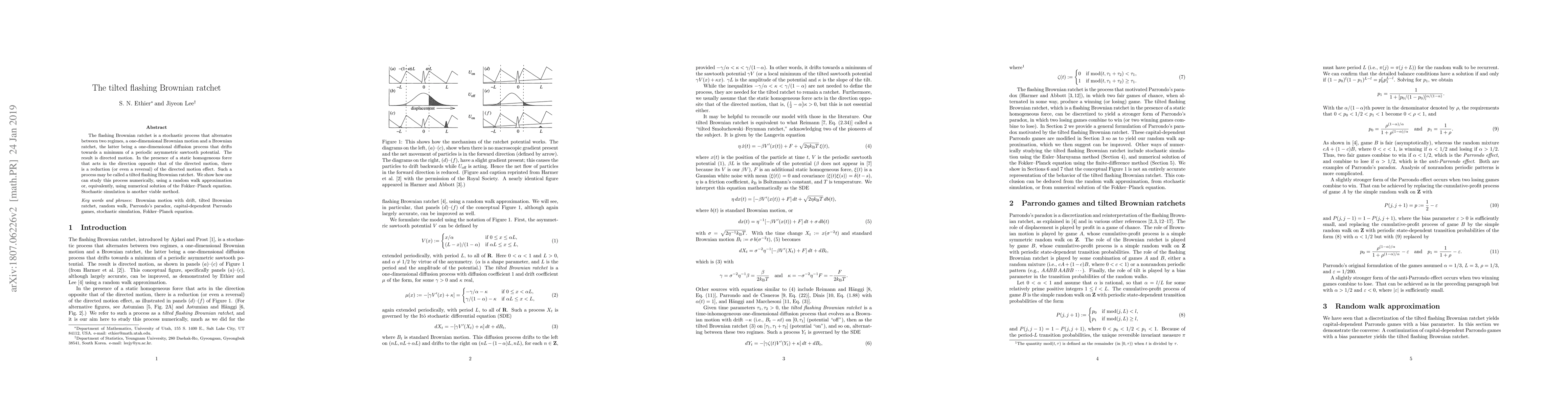 The tilted flashing Brownian ratchet alternates between Brownian motion and a ratchet process in a periodic potential, resulting in directed motion. The addition of a static opposing force reduces or reverses this motion, and the process can be studied numerically via random walk approximation, Fokker-Planck equation, or stochastic simulation.