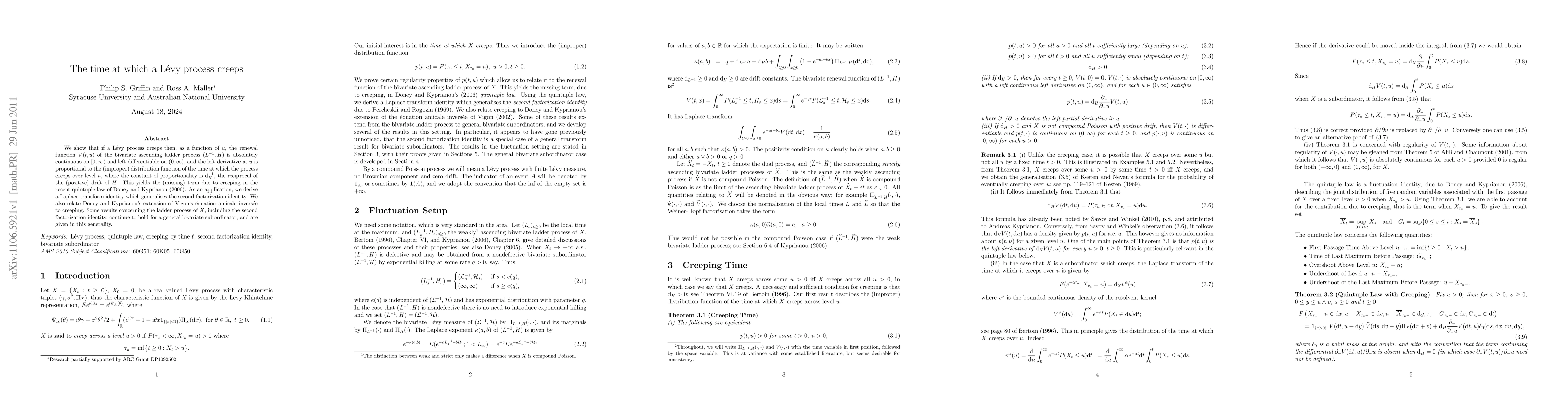 We show that if a L\'evy process creeps then, as a function of $u$, the renewal function $V(t,u)$ of the bivariate ascending ladder process $(L^{-1},H)$ is absolutely continuous on $[0,\infty)$ and left differentiable on $(0,\infty)$, and the left derivative at $u$ is proportional to the (improper) distribution function of the time at which the process creeps over level $u$, where the constant of proportionality is $\rmd_H^{-1}$, the reciprocal of the (positive) drift of $H$. This yields the (missing) term due to creeping in the recent quintuple law of Doney and Kyprianou (2006). As an application, we derive a Laplace transform identity which generalises the second factorization identity. We also relate Doney and Kyprianou's extension of Vigon's \'equation amicale invers\'ee to creeping. Some results concerning the ladder process of $X$, including the second factorization identity, continue to hold for a general bivariate subordinator, and are given in this generality.