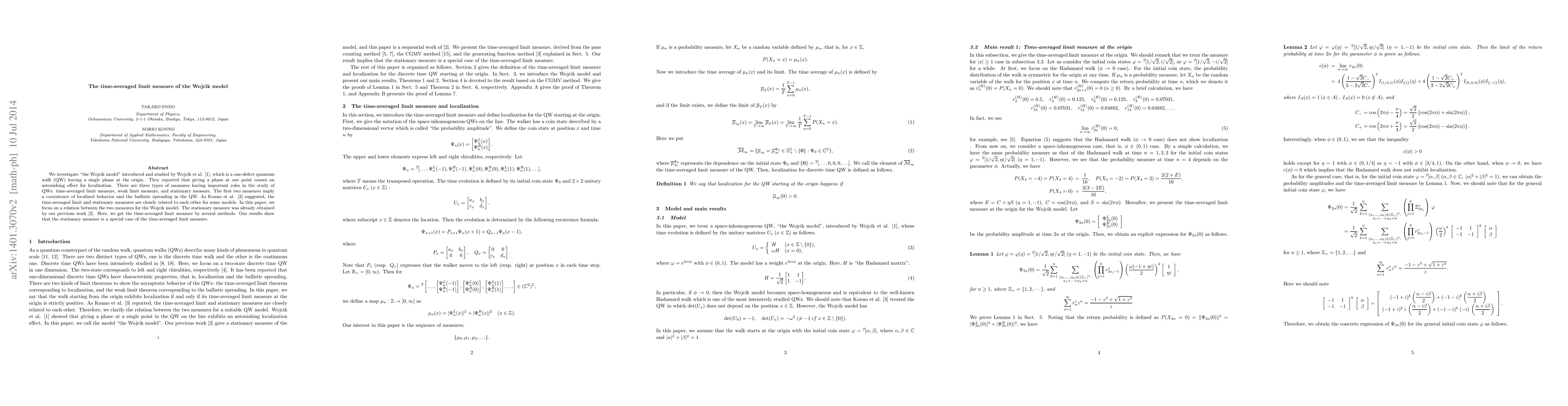 We investigate "the Wojcik model" introduced and studied by Wojcik et al., which is a one-defect quantum walk (QW) having a single phase at the origin. They reported that giving a phase at one point causes an astonishing effect for localization. There are three types of measures having important roles in the study of QWs: time-averaged limit measure, weak limit measure, and stationary measure. The first two measures imply a coexistence of localized behavior and the ballistic spreading in the QW. As Konno et al. suggested, the time-averaged limit and stationary measures are closely related to each other for some models. In this paper, we focus on a relation between the two measures for the Wojcik model. The stationary measure was already obtained by our previous work. Here, we get the time-averaged limit measure by several methods. Our results show that the stationary measure is a special case of the time-averaged limit measure.