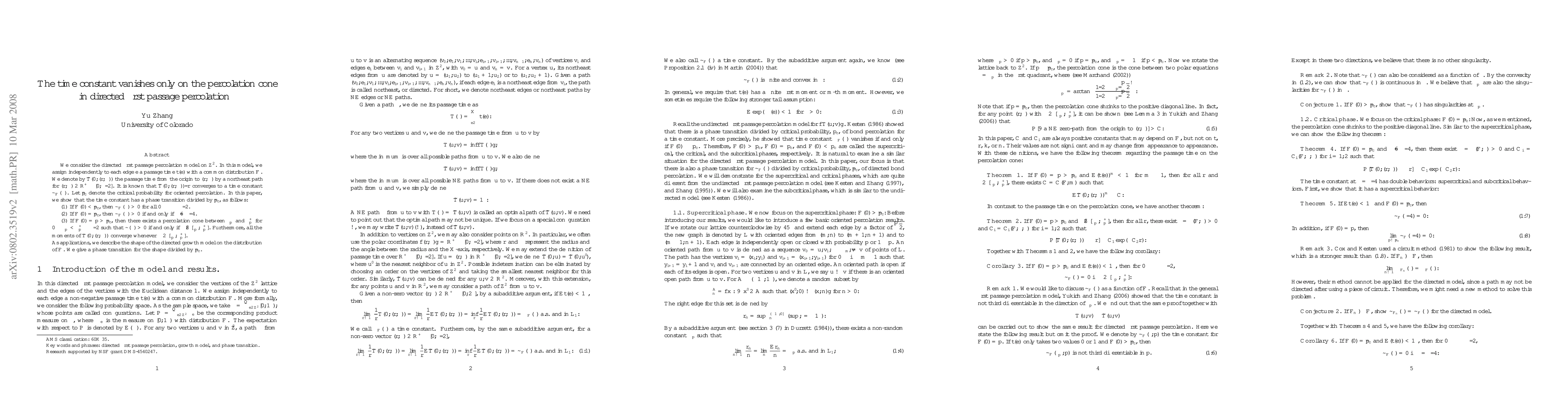 We consider the directed first passage percolation model on ${\bf Z}^2$. In this model, we assign independently to each edge $e$ a passage time $t(e)$ with a common distribution $F$. We denote by $\vec{T}({\bf 0}, (r,\theta))$ the passage time from the origin to $(r, \theta)$ by a northeast path for $(r, \theta)\in {\bf R}^+\times [0,\pi/2]$. It is known that $\vec{T}({\bf 0}, (r, \theta))/r$ converges to a time constant $\vec{\mu}_F (\theta)$. Let $\vec{p}_c$ denote the critical probability for oriented percolation. In this paper, we show that the time constant has a phase transition divided by $\vec{p}_c$, as follows: (1) If $F(0) < \vec{p}_c$, then $\vec{\mu}_F(\theta) >0$ for all $0\leq \theta\leq \pi/2$. (2) If $F(0) = \vec{p}_c$, then $\vec{\mu}_F(\theta) >0$ if and only if $\theta\neq \pi/4$. (3) If $F(0)=p > \vec{p}_c$, then there exists a percolation cone between $\theta_p^-$ and $\theta_p^+$ for $0\leq \theta^-_p< \theta^+_p \leq \pi/2$ such that $\vec{\mu} (\theta) >0$ if and only if $\theta\not\in [\theta_p^-, \theta^+_p]$. Furthermore, all the moments of $\vec{T}({\bf 0}, (r, \theta))$ converge whenever $\theta\in [\theta_p^-, \theta^+_p]$. As applications, we describe the shape of the directed growth model on the distribution of $F$. We give a phase transition for the shape divided by $\vec{p}_c$.