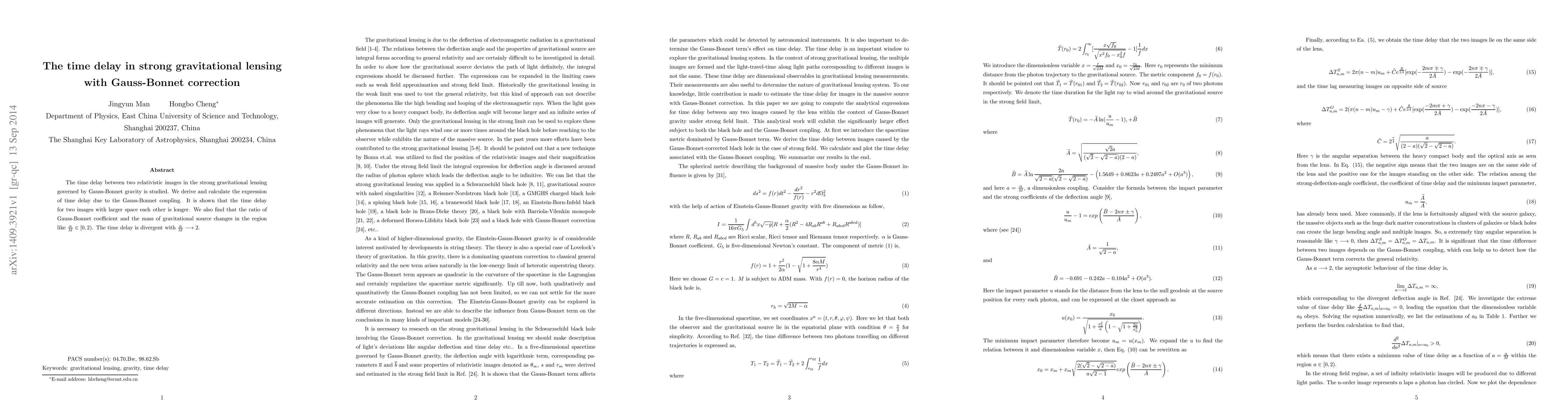 This paper investigates the time delay in strong gravitational lensing influenced by Gauss-Bonnet corrections. It derives an expression for the time delay, revealing that it increases with the spatial separation between images and diverges as the ratio of the Gauss-Bonnet coefficient to the mass approaches 2.