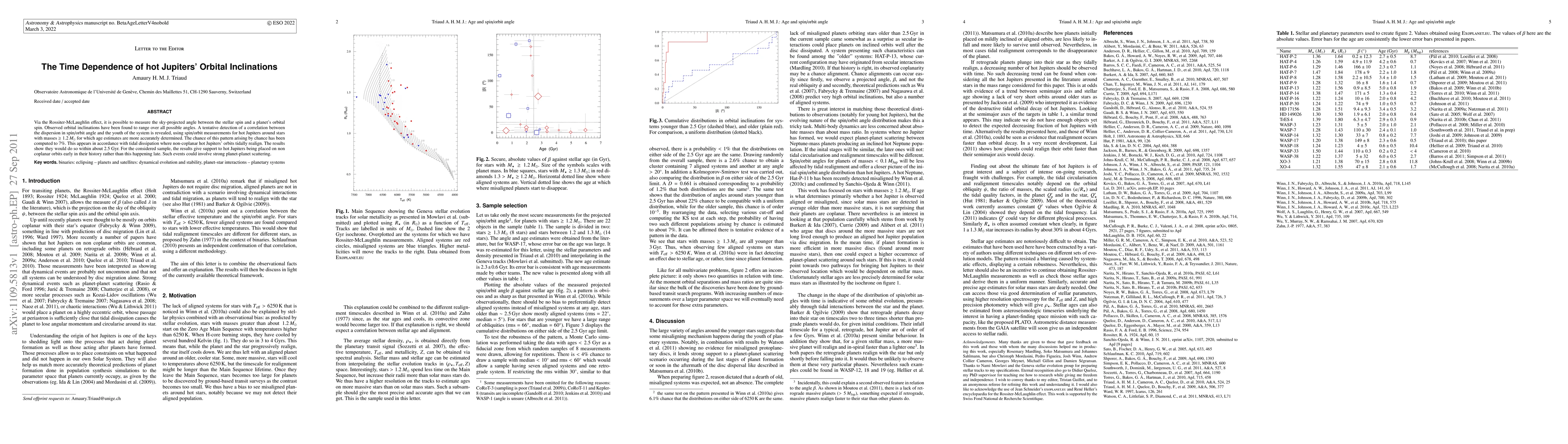 This study uses the Rossiter-McLaughlin effect to measure spin/orbit angles of hot Jupiters, finding a correlation between orbital inclination dispersion and the youth of the system. The findings suggest that hot Jupiters tend to realign their orbits within 2.5 Gyr, supporting the theory that non-coplanar orbits are established early in their history, likely due to strong planet-planet scattering.