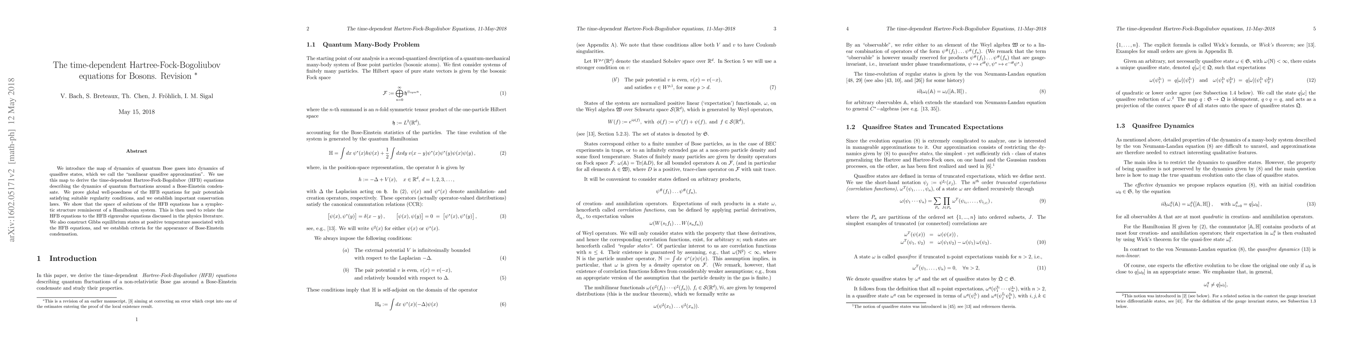 This paper derives the time-dependent Hartree-Fock-Bogoliubov (HFB) equations for Bosons using quasifree reduction, proving global well-posedness and establishing conservation laws. It also reveals a symplectic structure and connects the HFB equations to Hamiltonian dynamics, while constructing Gibbs states and criteria for Bose-Einstein condensation.