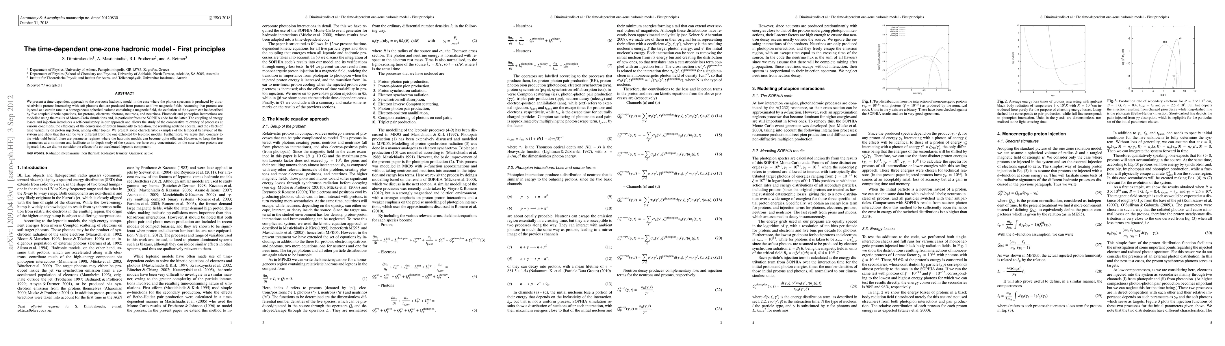 This paper introduces a time-dependent one-zone hadronic model for studying photon spectra from ultrarelativistic proton interactions with soft photons and low magnetic fields. Using five coupled kinetic equations, the model examines proton, electron, photon, neutron, and neutrino evolution. Monte-Carlo simulations, including SOPHIA code for photopion interactions, are employed. The research highlights distinct temporal system behaviors compared to leptonic models and identifies parameter regimes where hadronic models can be highly efficient, although it primarily focuses on proton injection without considering co-accelerated leptonic components to minimize free parameters.