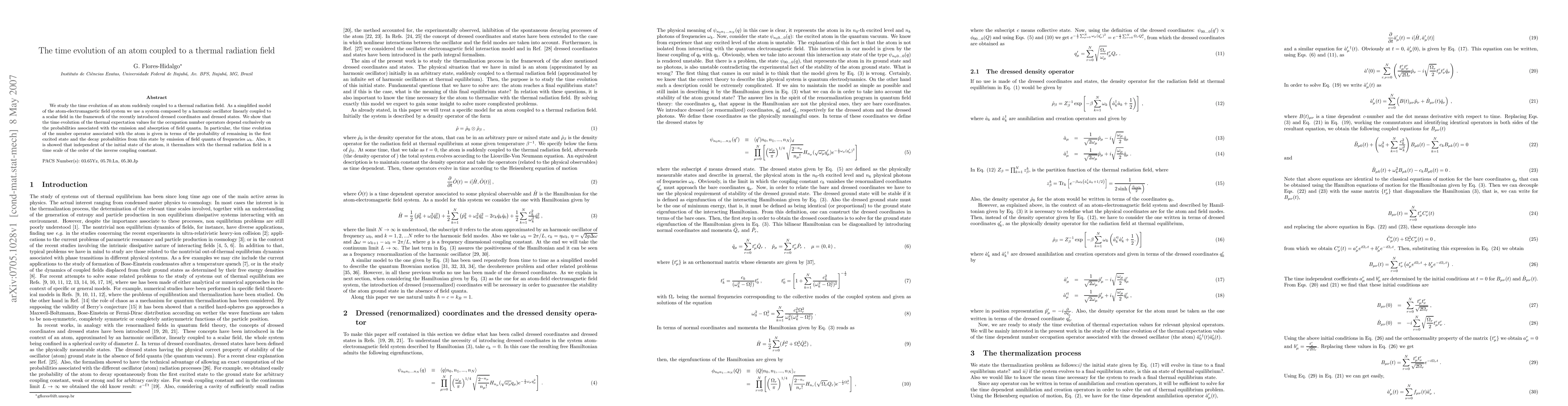 We study the time evolution of an atom suddenly coupled to a thermal radiation field. As a simplified model of the atom-electromagnetic field system we use a system composed by a harmonic oscillator linearly coupled to a scalar field in the framework of the recently introduced dressed coordinates and dressed states. We show that the time evolution of the thermal expectation values for the occupation number operators depend exclusively on the probabilities associated with the emission and absorption of field quanta. In particular, the time evolution of the number operator associated with the atom is given in terms of the probability of remaining in the first excited state and the decay probabilities from this state by emission of field quanta of frequencies $\omega_k$. Also, it is showed that independent of the initial state of the atom, it thermalizes with the thermal radiation field in a time scale of the order of the inverse coupling constant.
