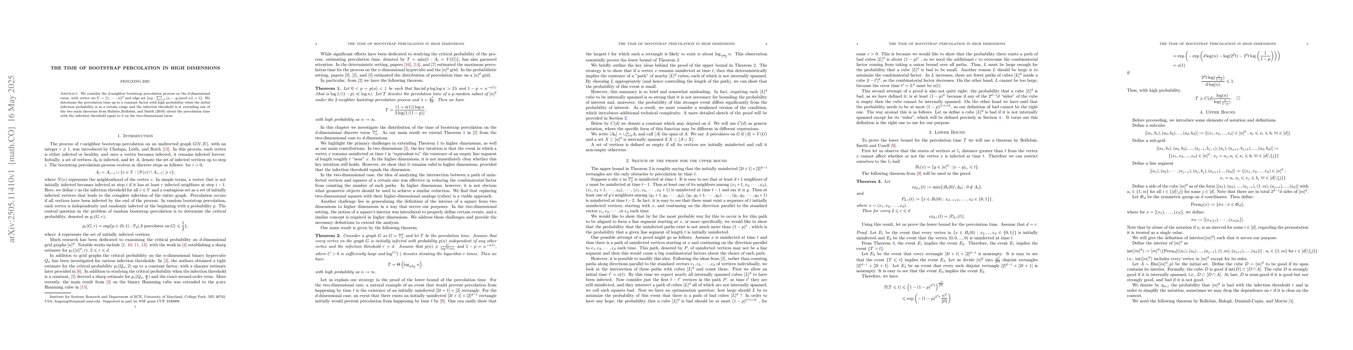 The paper presents a detailed analysis of the bootstrap percolation process in high dimensions, providing a constant factor approximation of the percolation time.
