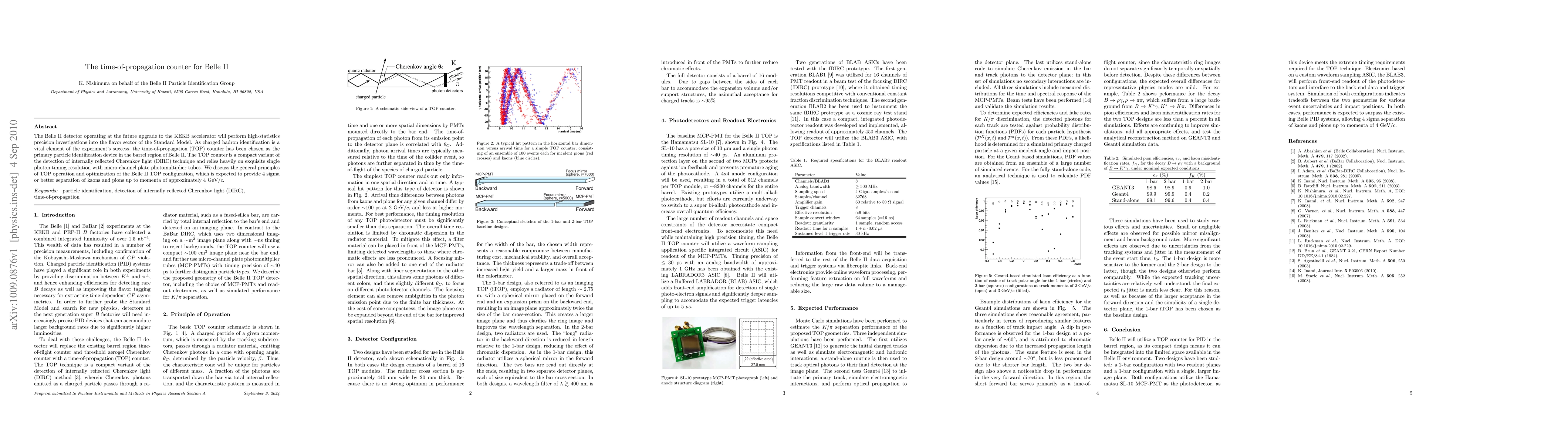 The Belle II experiment utilizes a time-of-propagation (TOP) counter based on internally reflected Cherenkov light for precise charged hadron identification. The TOP counter, with micro-channel plate photomultiplier tubes, aims to achieve 4 sigma or better separation of kaons and pions up to 4 GeV/c.