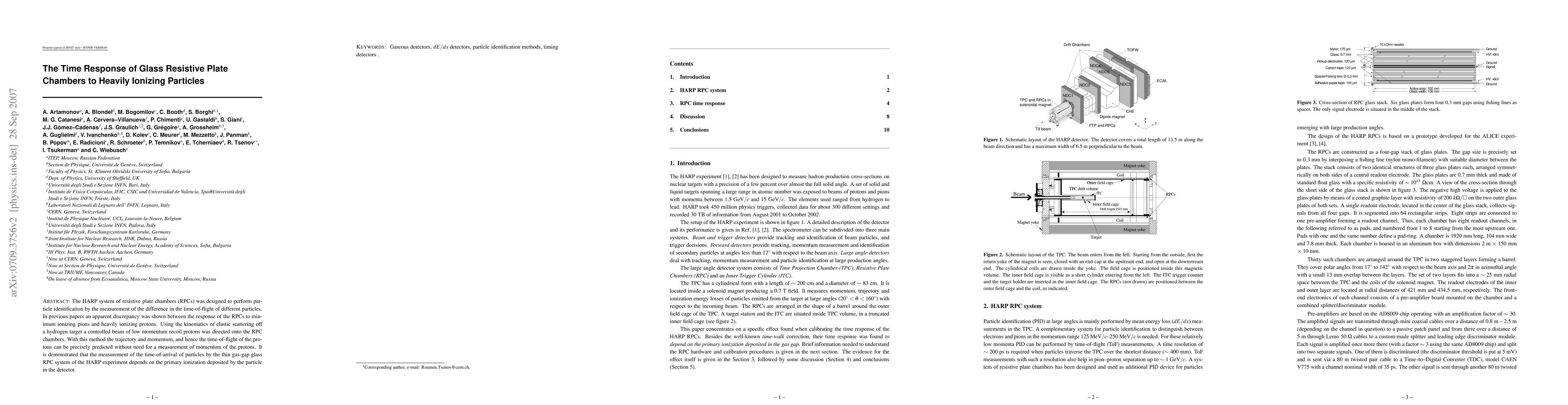 This paper investigates the time response of glass resistive plate chambers (RPCs) in the HARP system for identifying particles via time-of-flight measurements. It reveals that the time-of-arrival measurement depends on the primary ionization deposited by the particle, showing discrepancies in the response to minimum ionizing pions versus heavily ionizing protons.