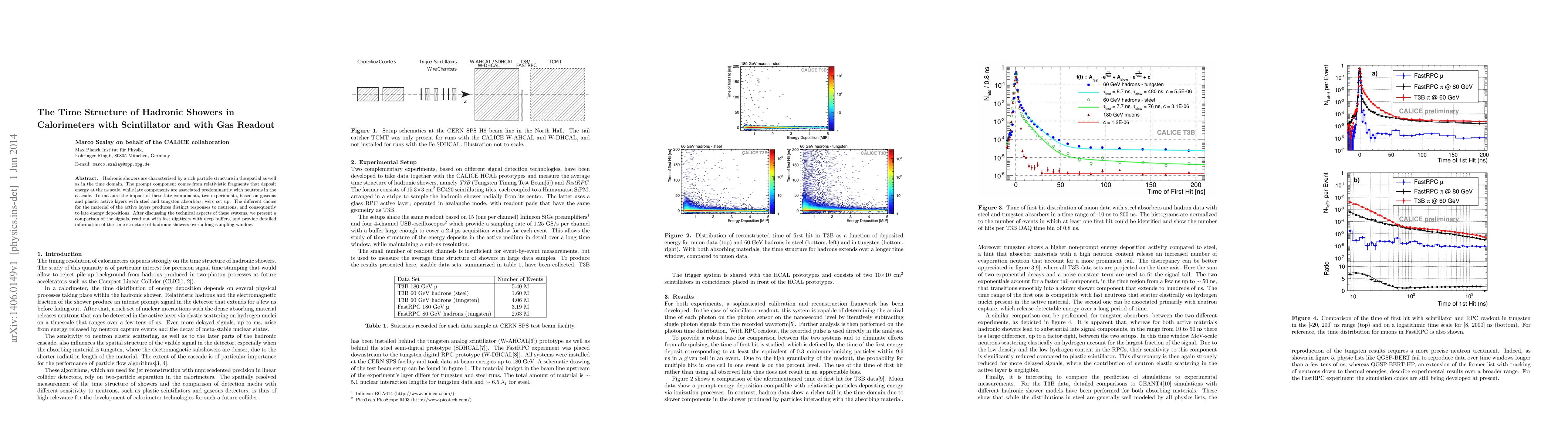 This paper investigates the time structure of hadronic showers in calorimeters using both scintillator and gas readout systems, comparing their responses to neutron-induced late energy depositions. The study provides detailed insights into the temporal characteristics of hadronic showers over an extended sampling window.