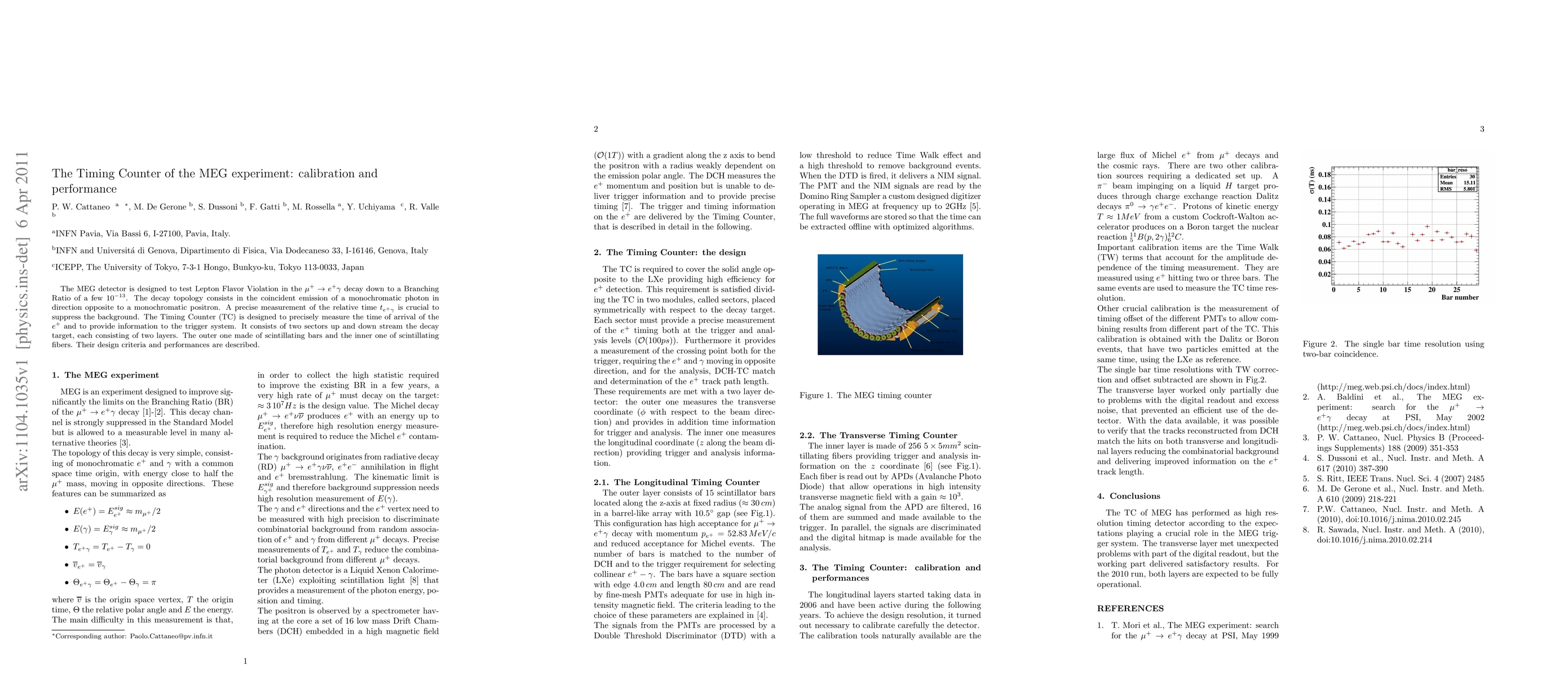 This paper discusses the calibration and performance of the Timing Counter (TC) in the MEG detector, which measures the time of arrival of positrons to suppress background noise in tests for Lepton Flavor Violation in $\mu^+\rightarrow e^+\gamma$ decay. The TC comprises two sectors with outer scintillating bars and inner scintillating fibers to achieve precise timing measurements.