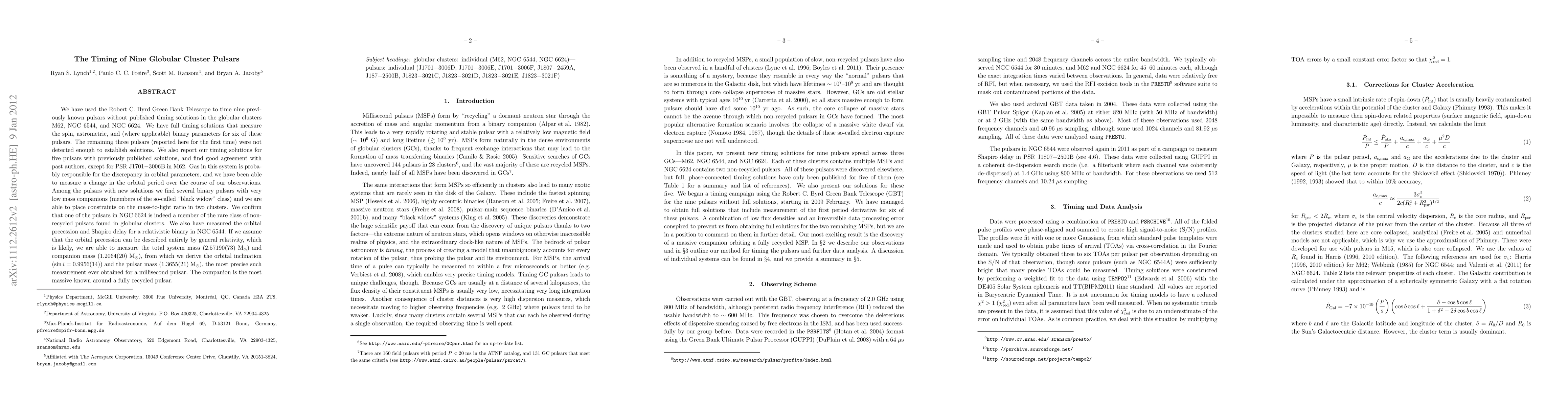 Researchers timed nine pulsars in globular clusters, discovering new binary pulsars with low-mass companions, and measuring the total system mass and companion mass of a relativistic binary for the first time.