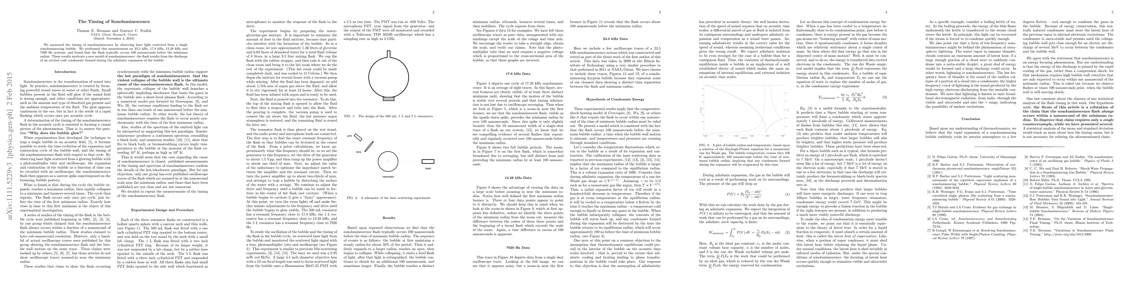 Researchers measured sonoluminescence timing at different frequencies, finding flashes occur 100 nanoseconds before bubble minimum radius. This suggests a new model of sonoluminescence: discharge from an excited cold condensate during adiabatic expansion.