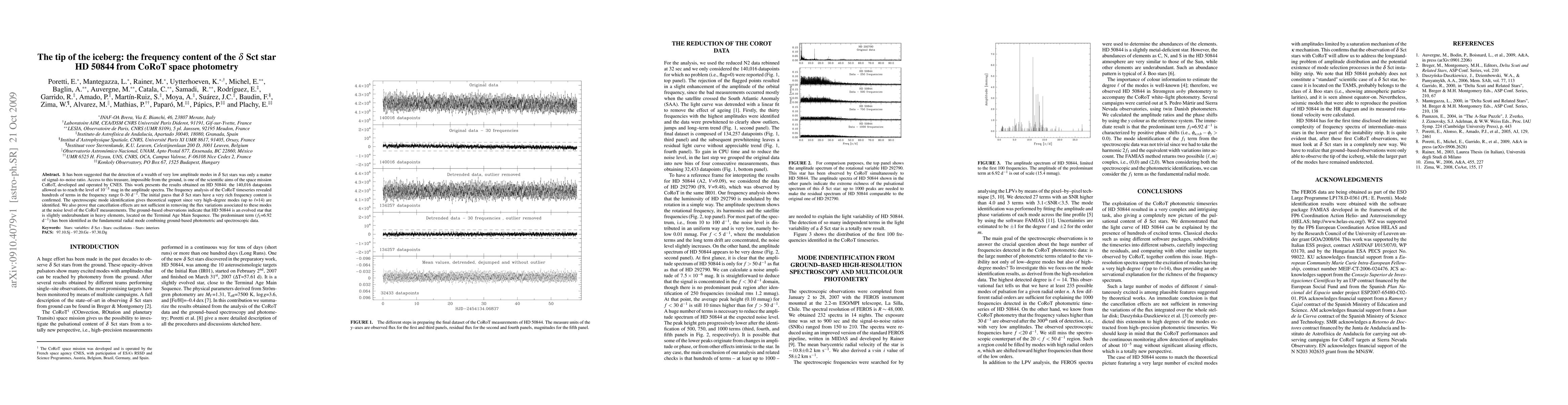 The CoRoT space mission observed HD 50844, a Delta Sct star, revealing hundreds of low-amplitude frequency terms up to 30 d⁻¹. Spectroscopic analysis identified very high-degree modes (up to ell=14), confirming the rich frequency content of Delta Sct stars, and proving that cancellation effects don't hinder detection at CoRoT's noise level. Ground-based observations classified HD 50844 as an evolved, slightly underabundant TAMS star with its predominant term identified as the fundamental radial mode.