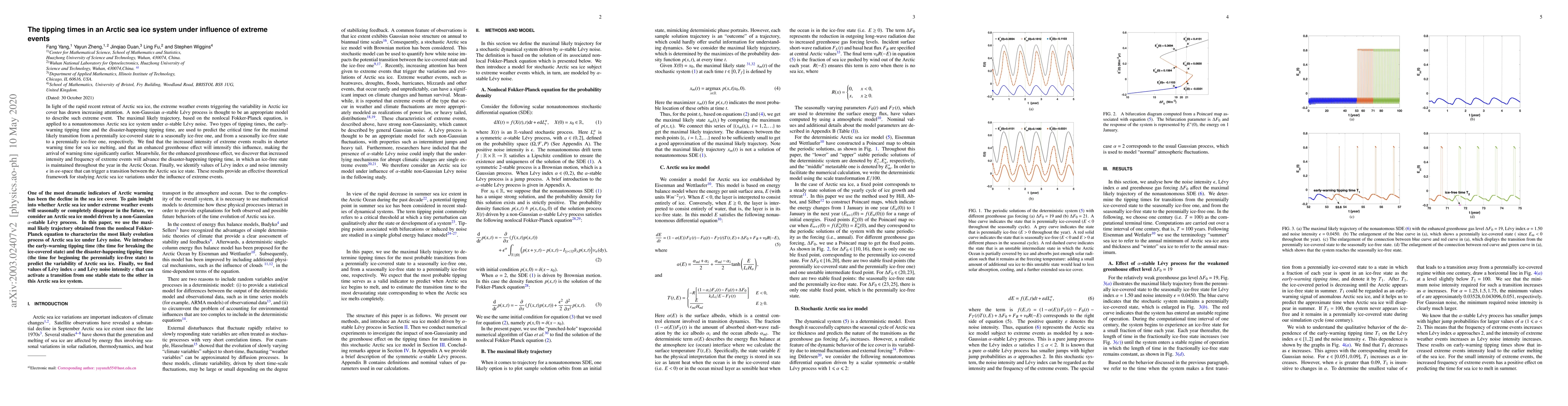 This paper investigates the tipping times in Arctic sea ice systems under extreme weather events using a non-Gaussian $\alpha$-stable L\'evy process. The study finds that increased extreme event intensity shortens the warning time for sea ice melting, with an enhanced greenhouse effect further accelerating this trend.