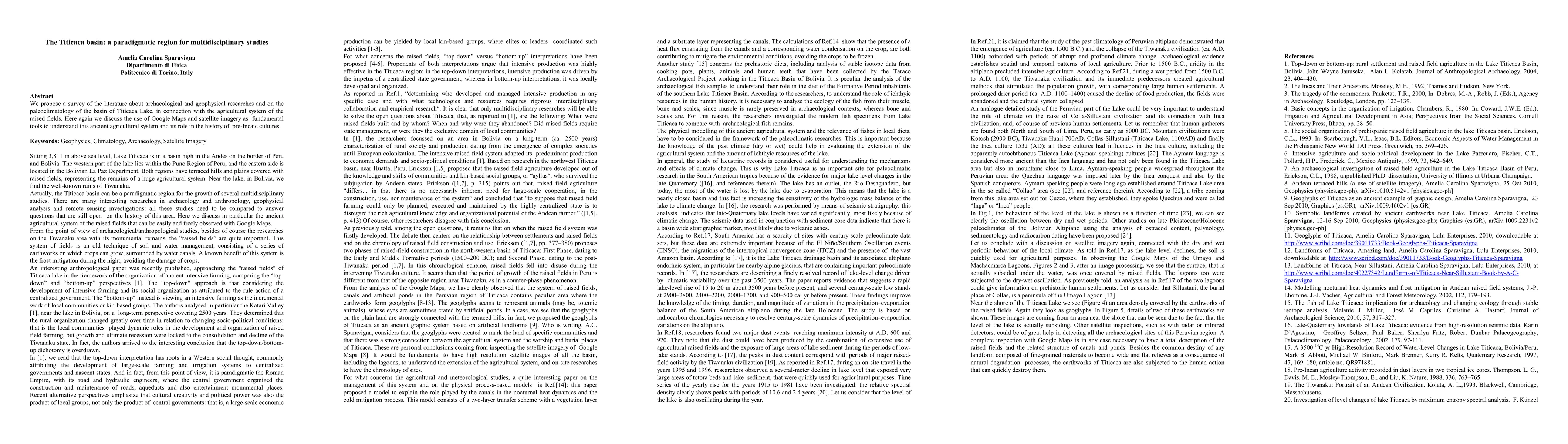 We propose a survey of the literature about archaeological and geophysical researches and on the paleoclimatology of the basin of Titicaca Lake, in connection with the agricultural system of the raised fields. Here again we discuss the use of Google Maps and satellite imagery as fundamental tools to understand this ancient agricultural system and its role in the history of pre-Incaic cultures.