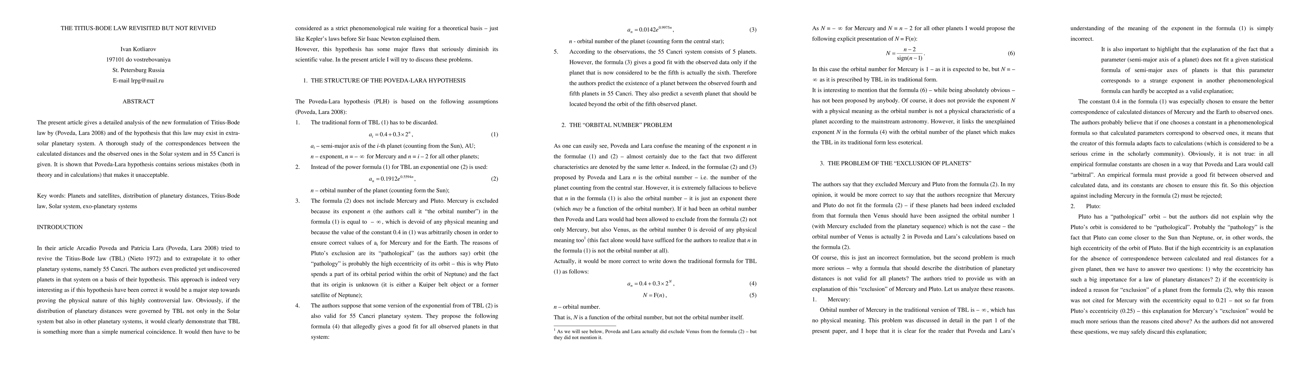 The paper critically examines the new formulation of the Titius-Bode law proposed by Poveda and Lara, finding significant theoretical and calculation errors that render the hypothesis invalid. It concludes that the law does not hold in extra-solar planetary systems like 55 Cancri.