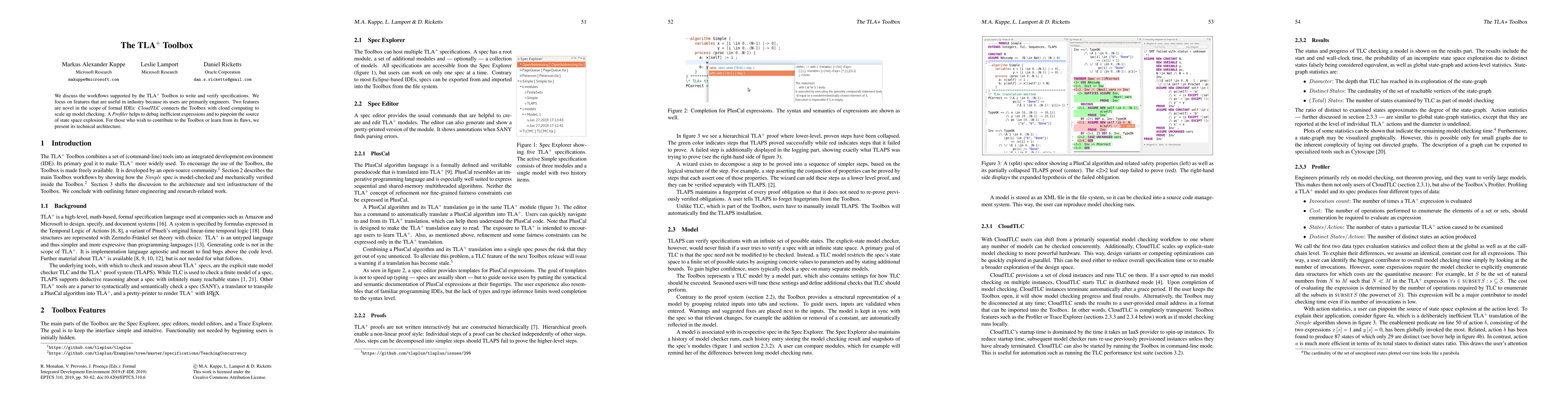 The TLA+ Toolbox supports workflows for writing and verifying specifications, with features tailored for industry engineers. It introduces novel capabilities, including CloudTLC for scalable model checking and a Profiler for debugging inefficient expressions, alongside a presentation of its technical architecture for contributors.