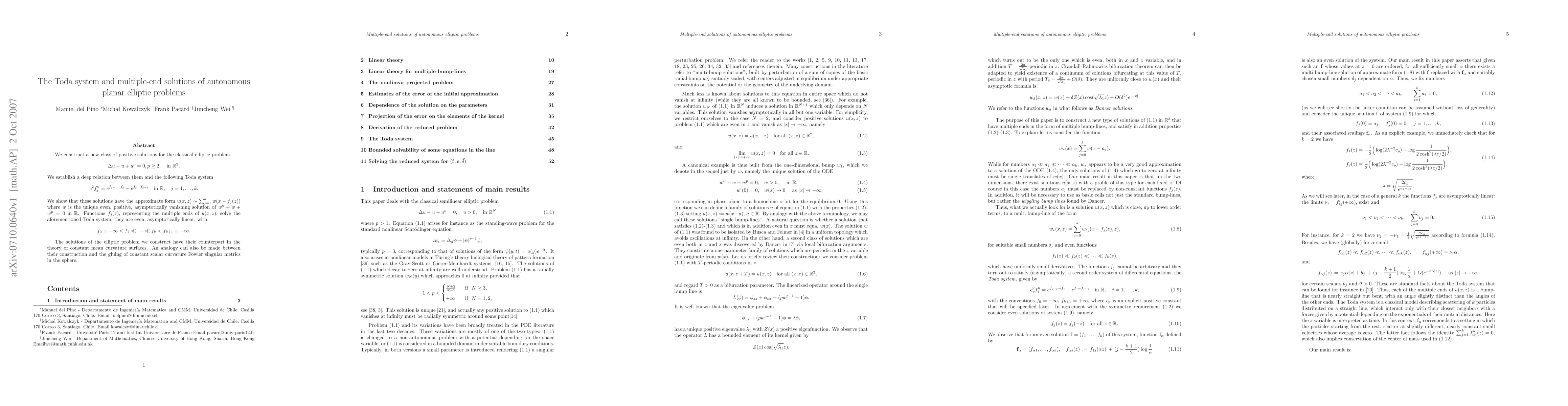 This research presents a novel class of positive solutions for a semilinear elliptic problem in two dimensions, applicable to models like the nonlinear Schrödinger equation and biological pattern formation systems. These solutions, characterized by energy growth linearly with radius, are linked to the Toda system.