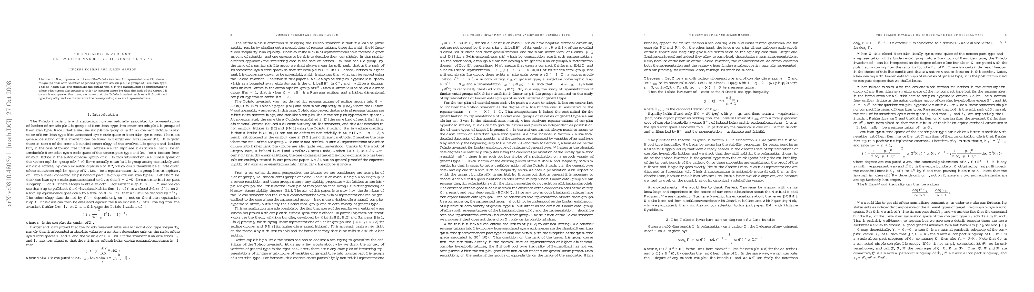 This paper introduces a Toledo invariant for representations of fundamental groups of smooth varieties of general type into semisimple Lie groups, extending classical results to new settings, and characterizes maximal representations under the Milnor-Wood inequality.