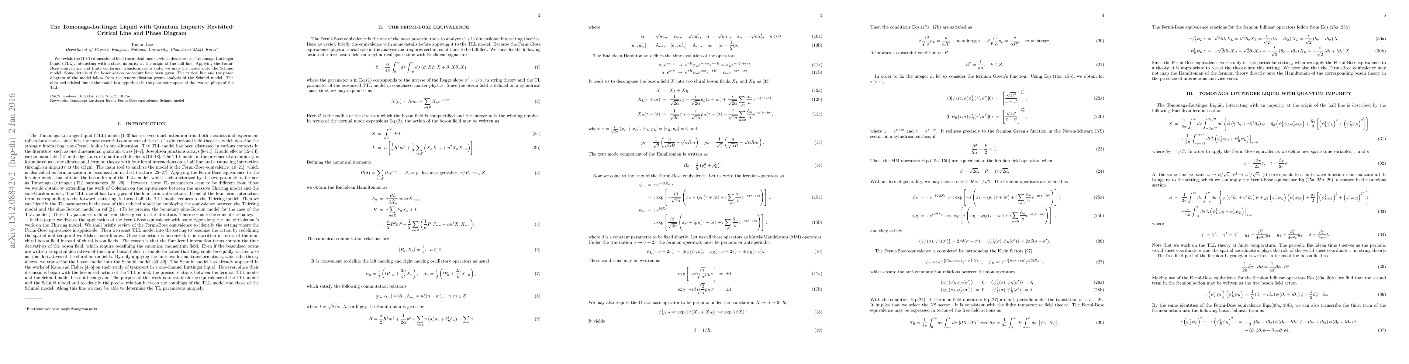 This paper revisits the $(1+1)$ dimensional Tomonaga-Luttinger liquid model with a static quantum impurity, mapping it to the Schmid model using Fermi-Bose equivalence and conformal transformations. The critical line and phase diagram are derived via renormalization group analysis, revealing a hyperbolic critical line in the parameter space.