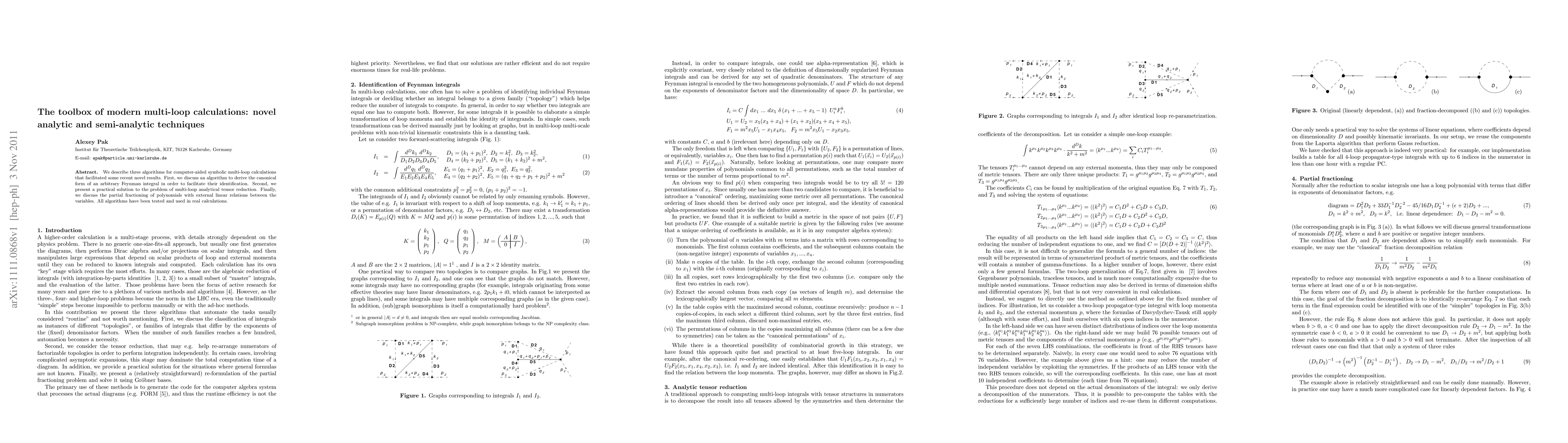 We describe three algorithms for computer-aided symbolic multi-loop calculations that facilitated some recent novel results. First, we discuss an algorithm to derive the canonical form of an arbitrary Feynman integral in order to facilitate their identification. Second, we present a practical solution to the problem of multi-loop analytical tensor reduction. Finally, we discuss the partial fractioning of polynomials with external linear relations between the variables. All algorithms have been tested and used in real calculations.