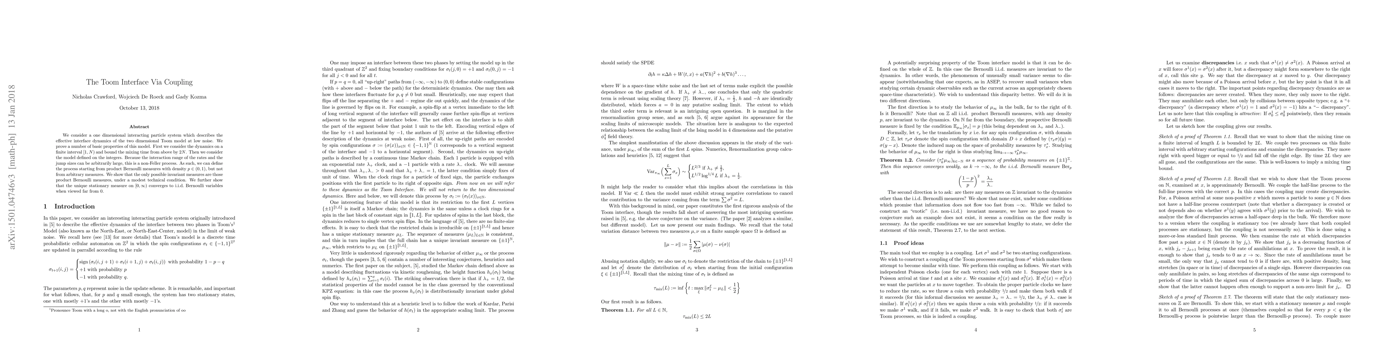 Researchers study a 1D particle system that describes the interface dynamics of the Toom model at low temperature and noise. They prove key properties of the model, including a finite mixing time for certain settings and invariant measures that converge to product Bernoulli measures.
