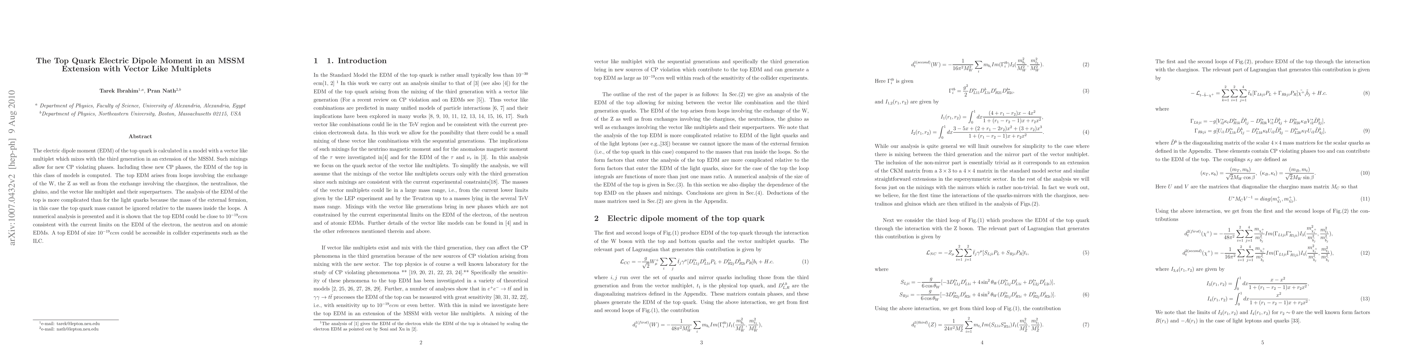 This paper calculates the electric dipole moment (EDM) of the top quark in an extended MSSM model with vector-like multiplets, revealing new CP-violating phases and complex loop contributions. The top quark EDM is estimated to be around $10^{-19} ecm$, potentially detectable in future collider experiments.