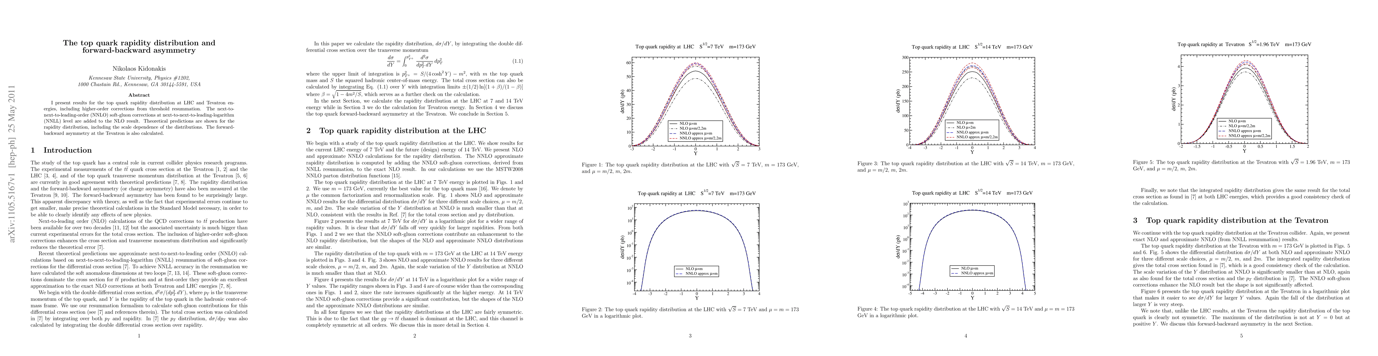 This paper presents refined theoretical predictions for the top quark rapidity distribution at LHC and Tevatron energies, incorporating higher-order corrections and next-to-next-to-leading-order soft-gluon resummation. It also calculates the forward-backward asymmetry at the Tevatron, highlighting the scale dependence of the distributions.