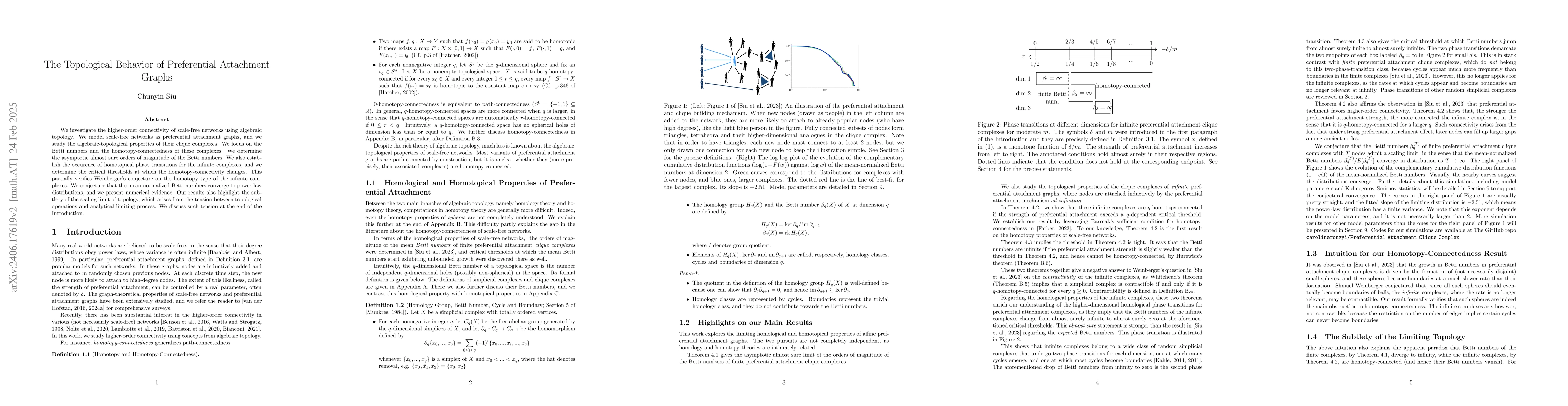 This paper examines the topological properties of preferential attachment graphs representing scale-free networks, focusing on their clique complexes' Betti numbers and homotopy-connectedness. It determines the asymptotic orders of Betti numbers and identifies critical thresholds for homotopy-connectivity changes, partially verifying Weinberger's conjecture and presenting numerical evidence for power-law distribution of mean-normalized Betti numbers.
