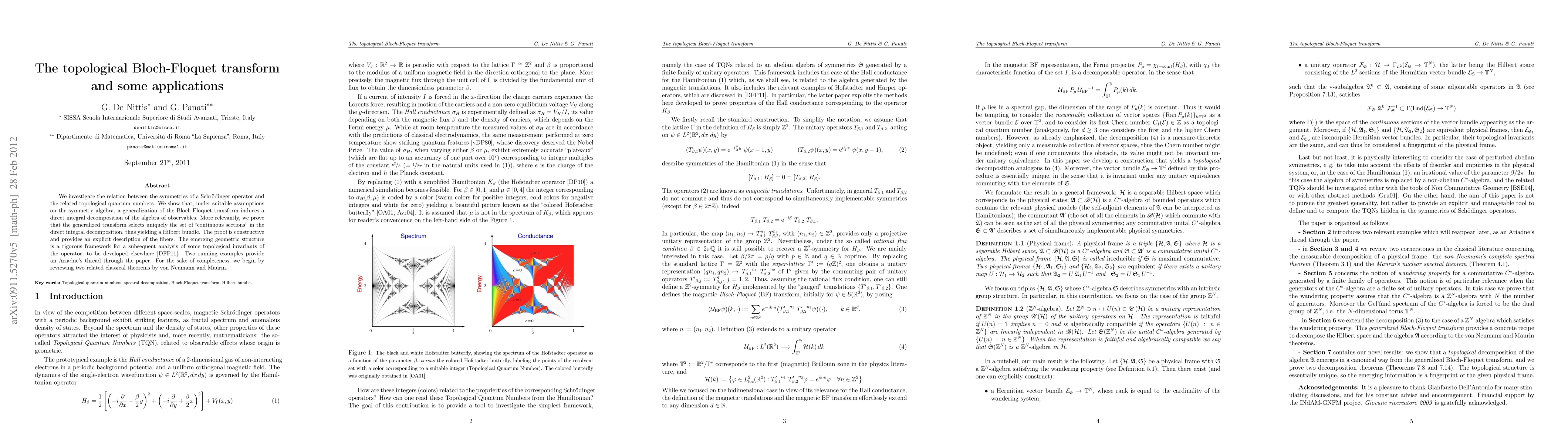 We investigate the relation between the symmetries of a Schr\"odinger operator and the related topological quantum numbers. We show that, under suitable assumptions on the symmetry algebra, a generalization of the Bloch-Floquet transform induces a direct integral decomposition of the algebra of observables. More relevantly, we prove that the generalized transform selects uniquely the set of "continuous sections" in the direct integral decomposition, thus yielding a Hilbert bundle. The proof is constructive and provides an explicit description of the fibers. The emerging geometric structure is a rigorous framework for a subsequent analysis of some topological invariants of the operator, to be developed elsewhere. Two running examples provide an Ariadne's thread through the paper. For the sake of completeness, we begin by reviewing two related classical theorems by von Neumann and Maurin.