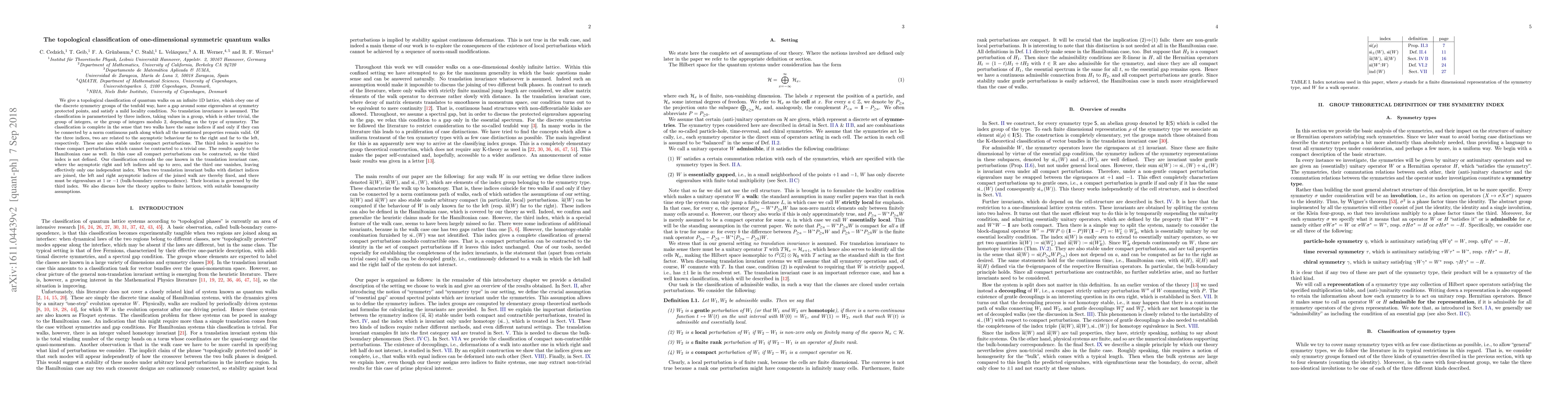 We give a topological classification of quantum walks on an infinite 1D lattice, which obey one of the discrete symmetry groups of the tenfold way, have a gap around some eigenvalues at symmetry protected points, and satisfy a mild locality condition. No translation invariance is assumed. The classification is parameterized by three indices, taking values in a group, which is either trivial, the group of integers, or the group of integers modulo 2, depending on the type of symmetry. The classification is complete in the sense that two walks have the same indices if and only if they can be connected by a norm continuous path along which all the mentioned properties remain valid. Of the three indices, two are related to the asymptotic behaviour far to the right and far to the left, respectively. These are also stable under compact perturbations. The third index is sensitive to those compact perturbations which cannot be contracted to a trivial one. The results apply to the Hamiltonian case as well. In this case all compact perturbations can be contracted, so the third index is not defined. Our classification extends the one known in the translation invariant case, where the asymptotic right and left indices add up to zero, and the third one vanishes, leaving effectively only one independent index. When two translationally invariant bulks with distinct indices are joined, the left and right asymptotic indices of the joined walk are thereby fixed, and there must be eigenvalues at $1$ or $-1$ (bulk-boundary correspondence). Their location is governed by the third index. We also discuss how the theory applies to finite lattices, with suitable homogeneity assumptions.