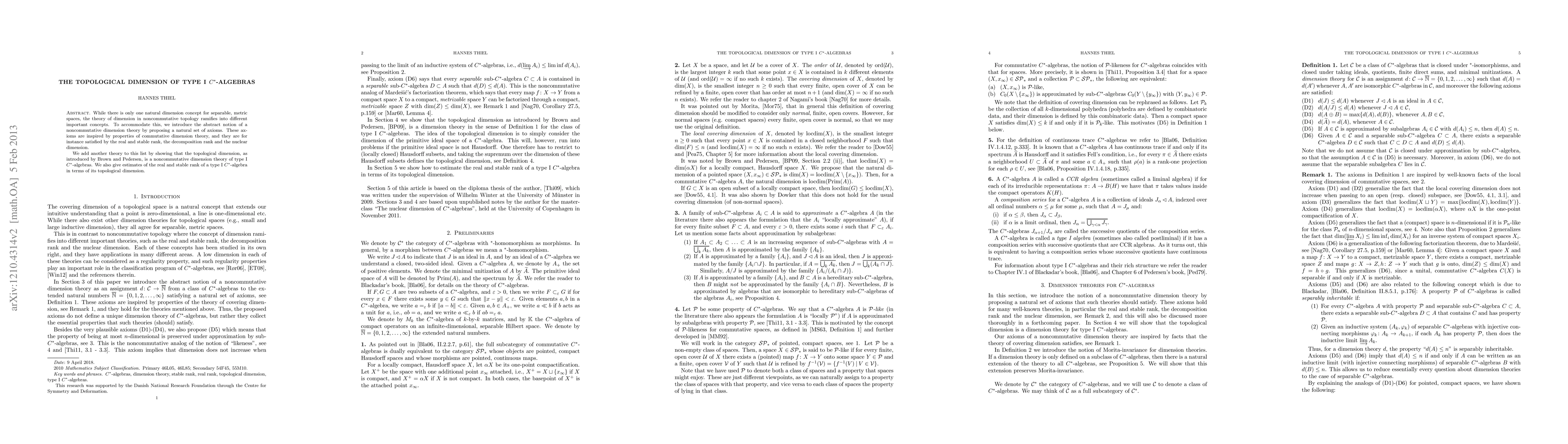 This research introduces a noncommutative dimension theory for C*-algebras, extending commutative dimension concepts. It proves that the topological dimension, as defined by Brown and Pedersen, is a noncommutative dimension theory specifically for type I C*-algebras, and provides estimates of real and stable ranks using topological dimension.