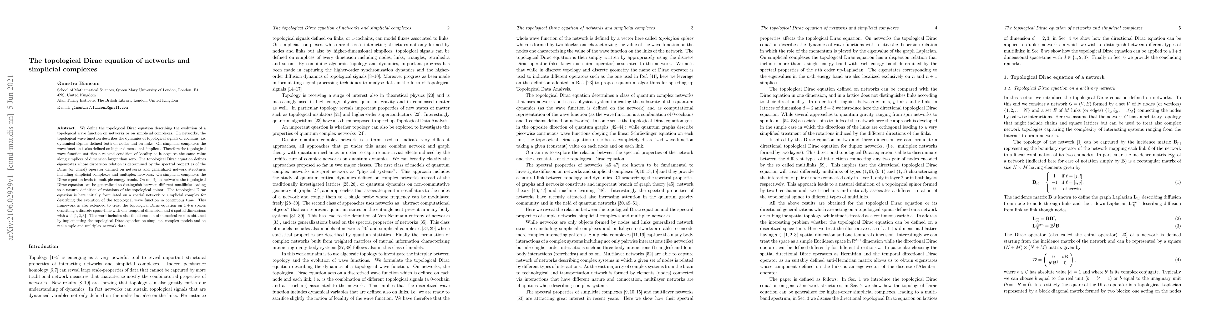 The paper introduces the topological Dirac equation for networks and simplicial complexes, describing the evolution of topological wave functions that incorporate signals defined on nodes, links, and higher-dimensional simplices. It discusses the spectral properties of the Dirac operator and its application to multiplex networks, including the emergence of multiple energy bands and the definition of rotations in topological spinors.