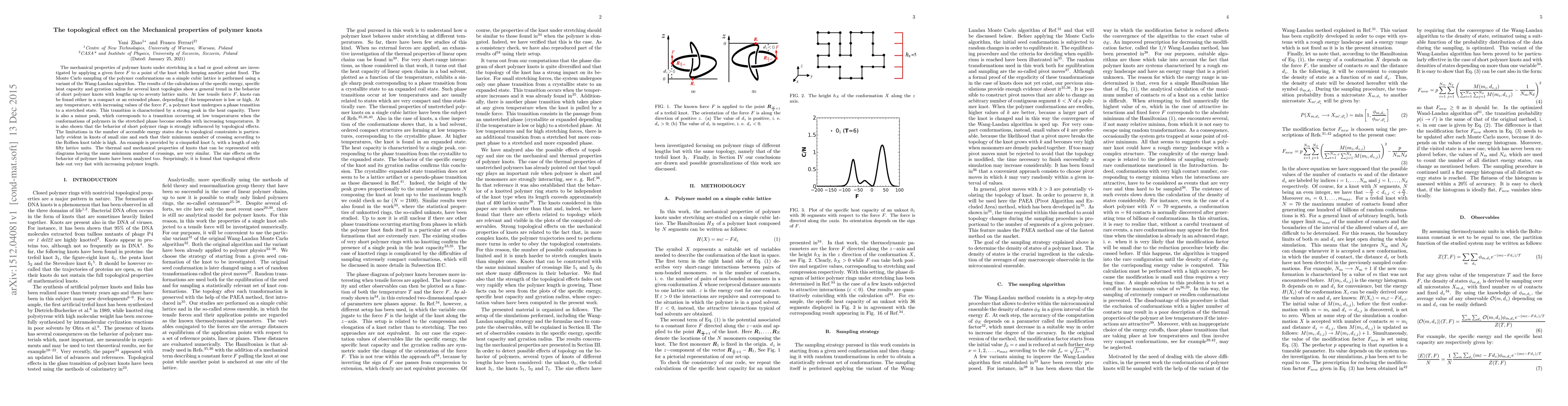 A study investigates how the shape of polymer knots affects their mechanical properties when stretched in a solution. It finds that short polymer knots exhibit phase transitions with increasing force, while topological effects fade quickly with increasing length.