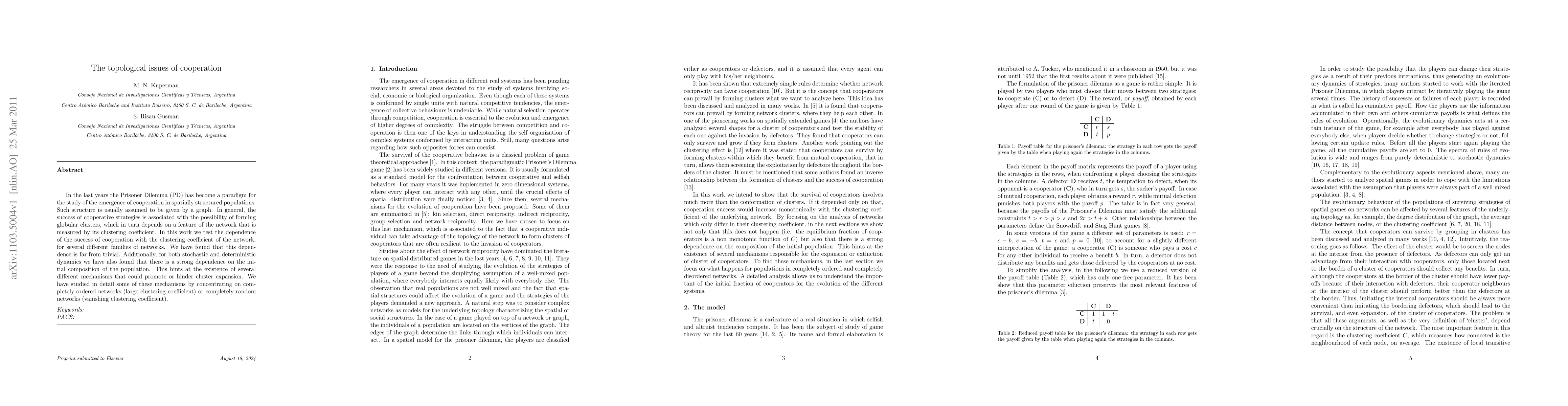 In the last years the Prisoner Dilemma (PD) has become a paradigm for the study of the emergence of cooperation in spatially structured populations. Such structure is usually assumed to be given by a graph. In general, the success of cooperative strategies is associated with the possibility of forming globular clusters, which in turn depends on a feature of the network that is measured by its clustering coefficient. In this work we test the dependence of the success of cooperation with the clustering coefficient of the network, for several different families of networks. We have found that this dependence is far from trivial. Additionally, for both stochastic and deterministic dynamics we have also found that there is a strong dependence on the initial composition of the population. This hints at the existence of several different mechanisms that could promote or hinder cluster expansion. We have studied in detail some of these mechanisms by concentrating on completely ordered networks (large clustering coefficient) or completely random networks (vanishing clustering coefficient).