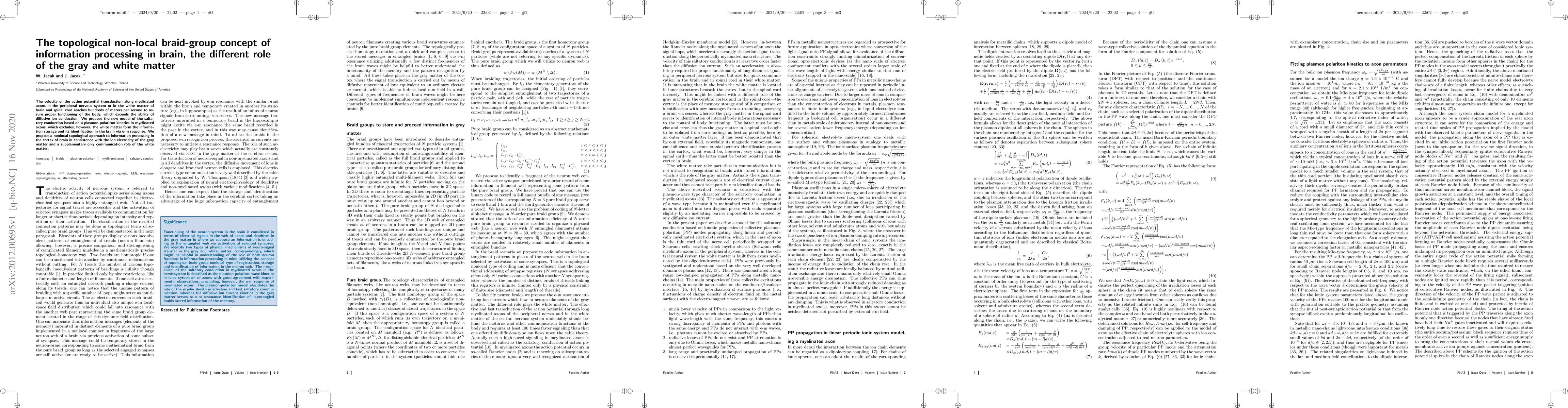 The velocity of the action potential transduction along myelinated axons in the peripheral nervous system or in the white matter of brain and spinal cord reaches hundreds of meters per second to assure proper functioning of the body, which exceeds the ability of diffusive ion conduction. We propose the new model of the saltatory conduction based on a plasmon-polariton kinetics in myelinated axons, which excludes, however, the white matter form the information storage and its identification in the brain via e-m response. We propose a nonlocal topological approach to information processing in the cortex of brain in consistence with the ion electricity of the gray matter and a supplementary only communication role of the white matter.
