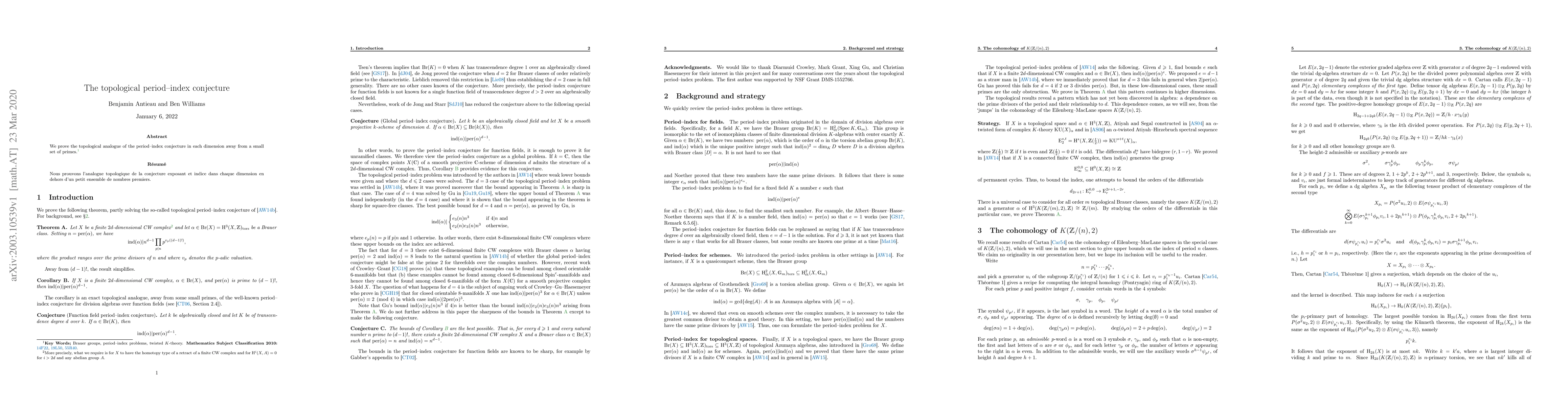 Summary: The paper proves the topological analogue of the period-index conjecture in dimensions not belonging to a specific set of primes, establishing a significant result in algebraic topology.