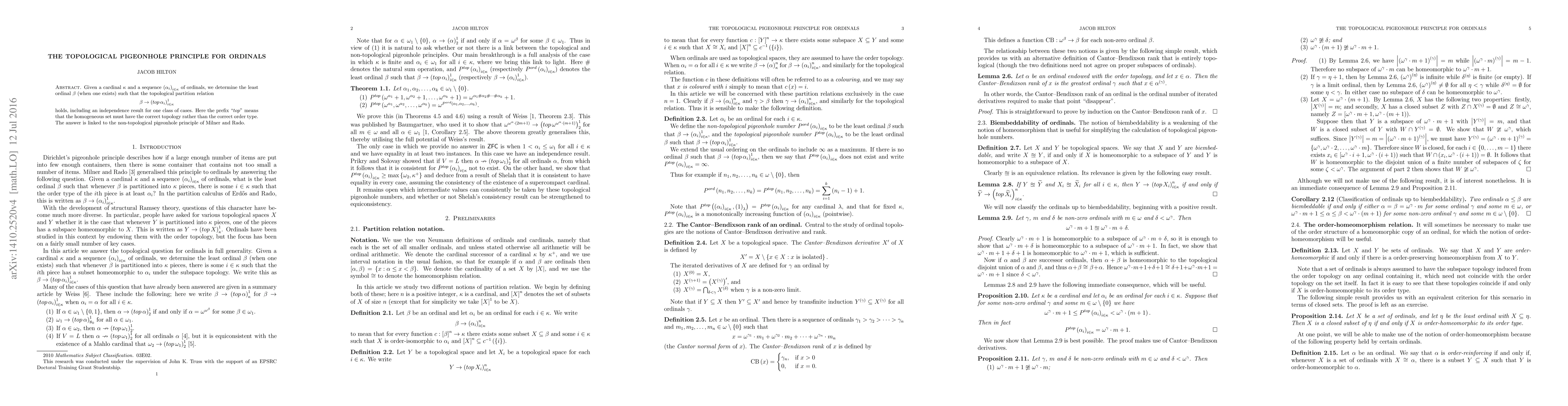 The paper introduces and analyzes the topological pigeonhole principle for sequences of ordinals, extending previous work on partition relations for ordinals.