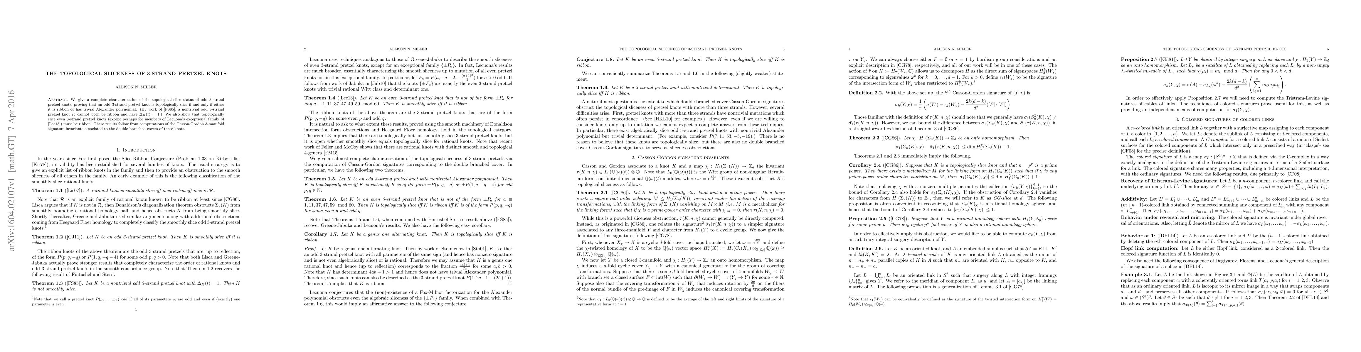 Summary: This paper provides a complete characterization of the topological sliceness of odd 3-strand pretzel knots, demonstrating they are slice if ribbon or have a trivial Alexander polynomial. Even 3-strand pretzel knots, excluding Lecuona's exceptional family, are also shown to be slice if ribbon, based on Casson-Gordon signature computations.