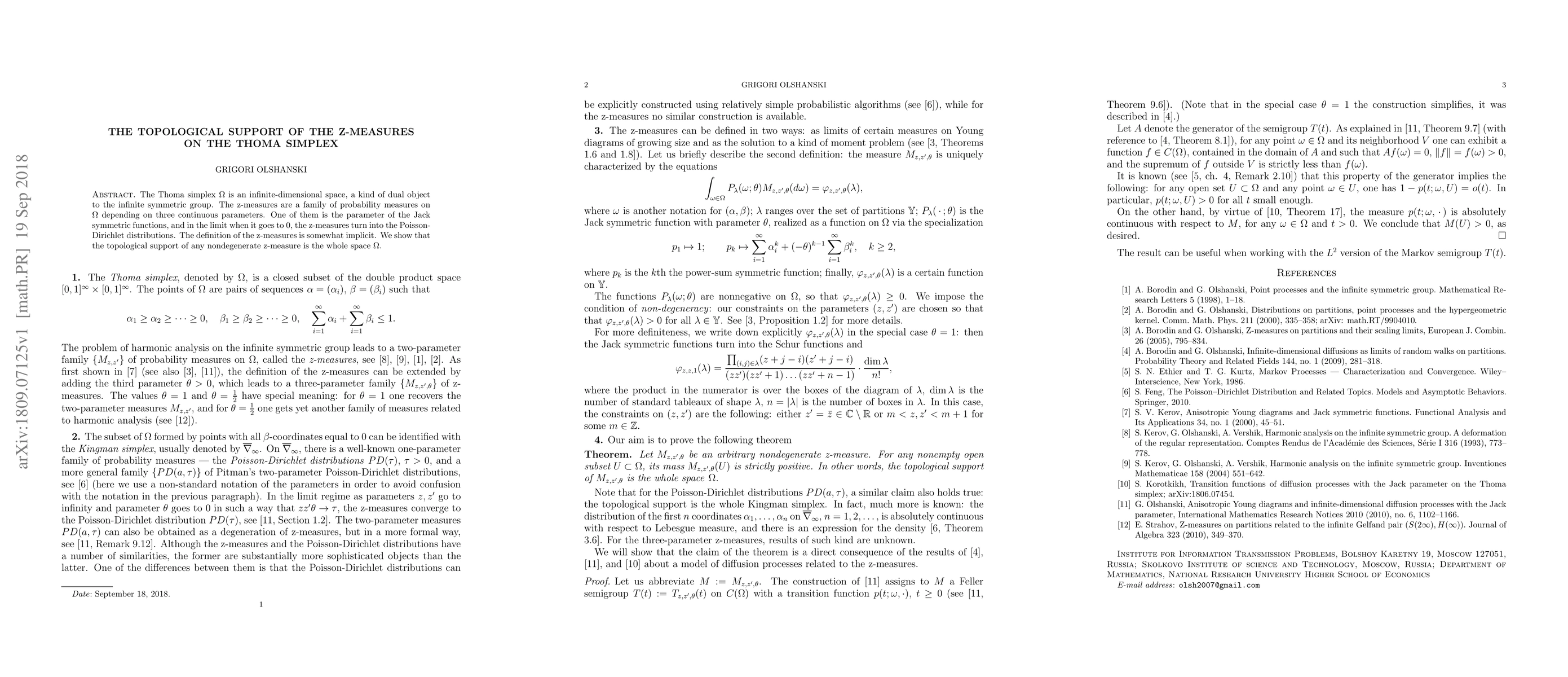 The Thoma simplex $\Omega$ is an infinite-dimensional space, a kind of dual object to the infinite symmetric group. The z-measures are a family of probability measures on $\Omega$ depending on three continuous parameters. One of them is the parameter of the Jack symmetric functions, and in the limit when it goes to $0$, the z-measures turn into the Poisson-Dirichlet distributions. The definition of the z-measures is somewhat implicit. We show that the topological support of any nondegenerate z-measure is the whole space $\Omega$. The proof is based on results of arXiv:0902.3395 and arXiv:1806.07454.