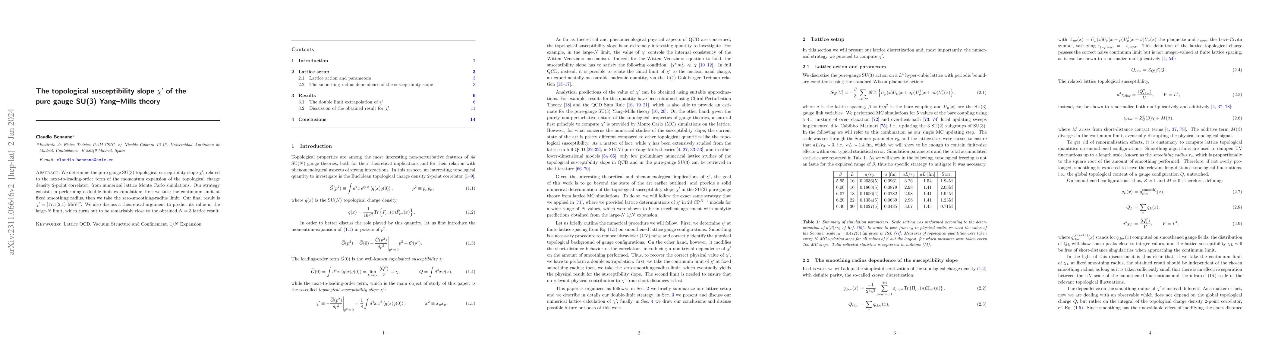 This paper reports the numerical determination of the topological susceptibility slope $\chi^\prime$ in pure-gauge $\mathrm{SU}(3)$ Yang-Mills theory using lattice Monte Carlo simulations. The authors achieve this through a double-limit extrapolation and find $\chi^\prime = [17.1(2.1)~\mathrm{MeV}]^2$, with a theoretical prediction in the large-$N$ limit closely matching the result.