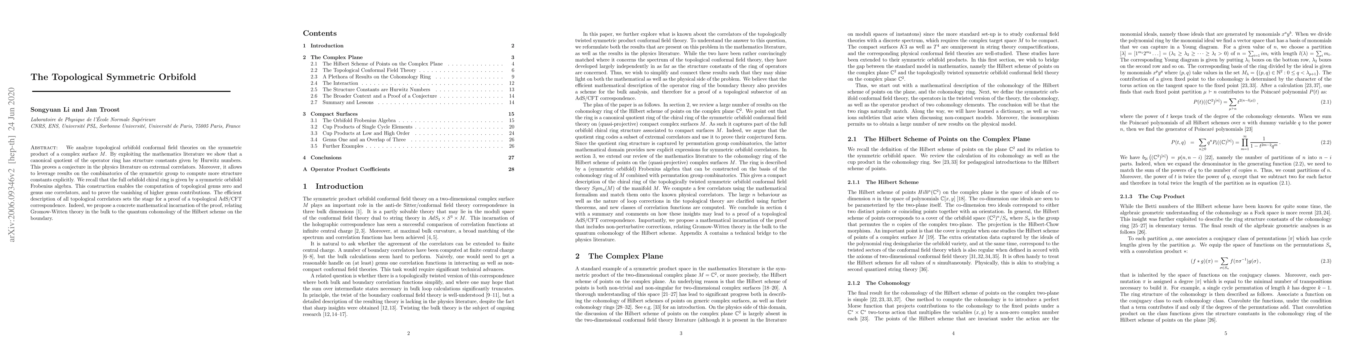 The paper presents a detailed mathematical description of the topological symmetric orbifold conformal field theory, linking it to the cohomology ring of the Hilbert scheme of points on a complex surface, and proving a conjecture on extremal correlators using Hurwitz numbers.