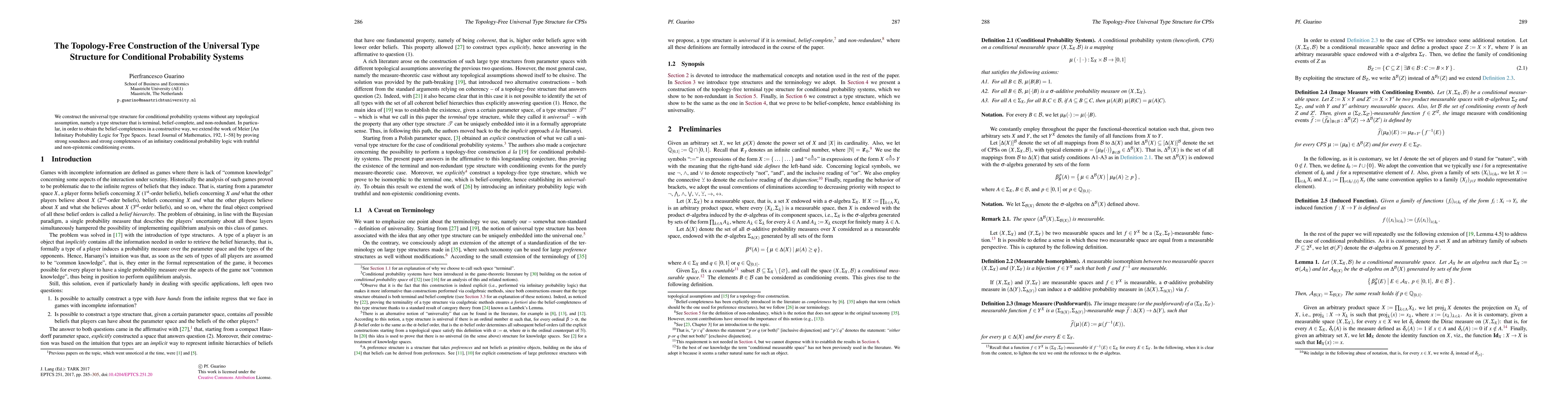 Researchers developed a new type structure for conditional probability systems without topological assumptions, creating a universal framework for belief-completeness and non-redundancy in a constructive way.